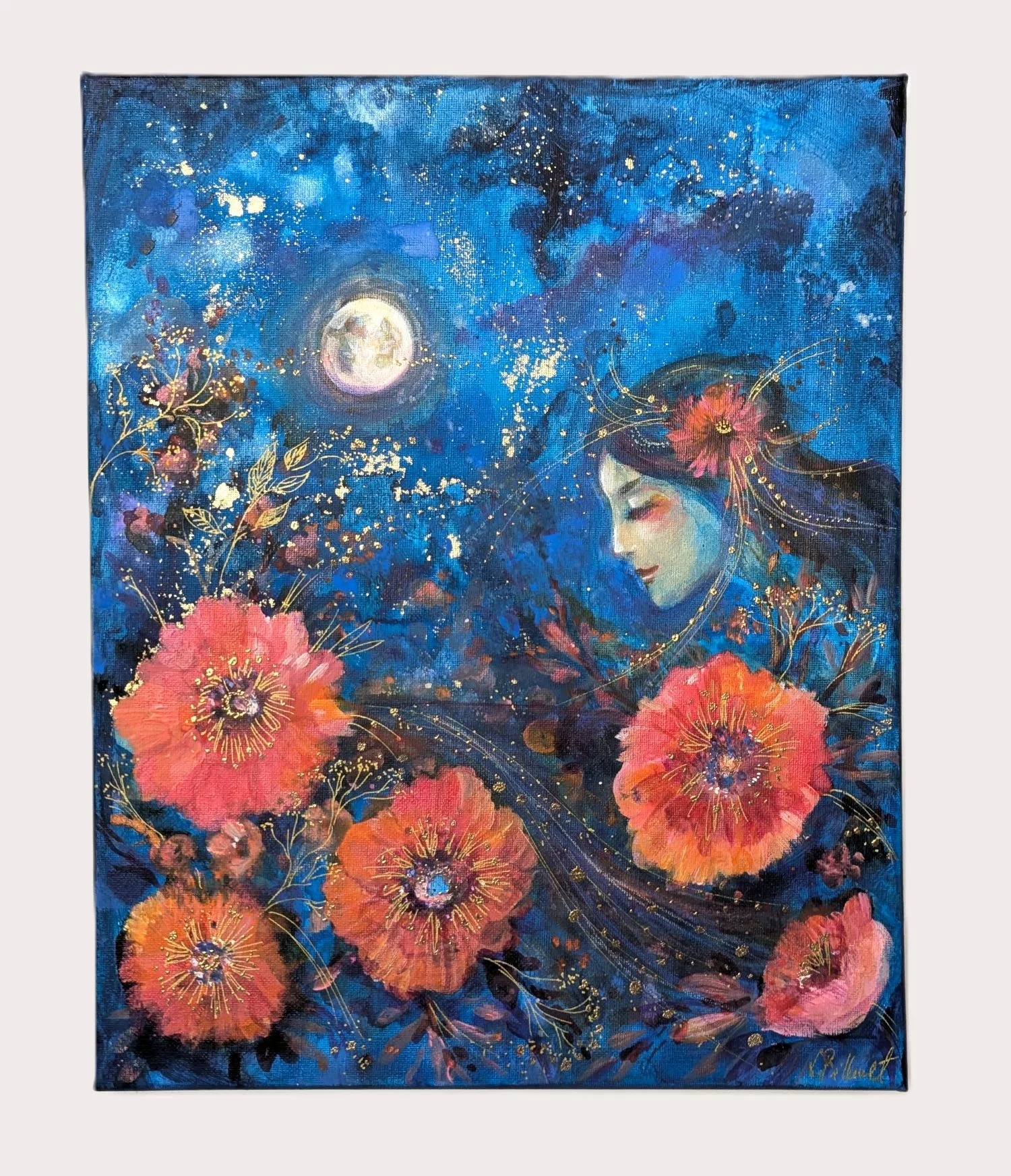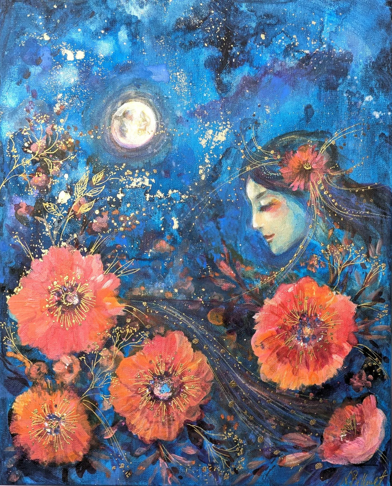 Paysage de nuit étoilé aux grandes fleurs épanouies avec un profil de femme rêveuse et poétique.
