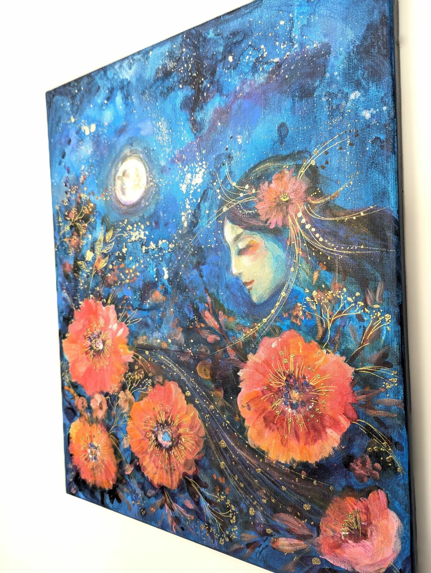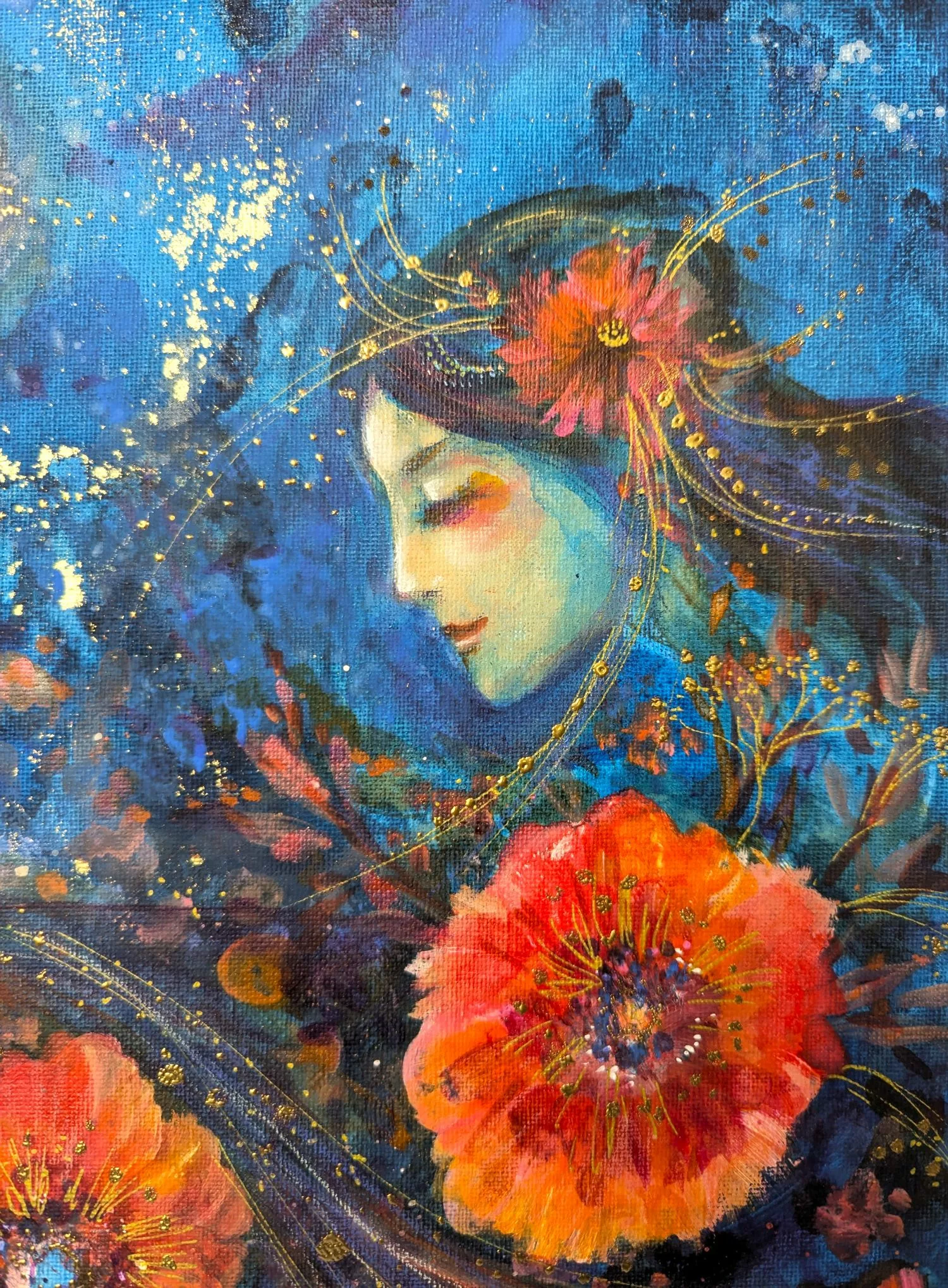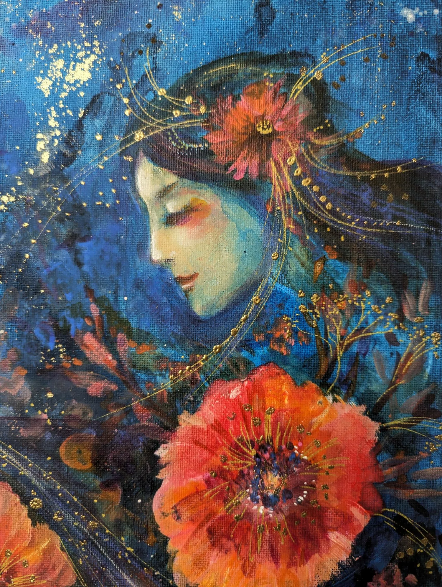 Femme céleste dans un ciel fleuri et étoilé. Eclats de rêves.
