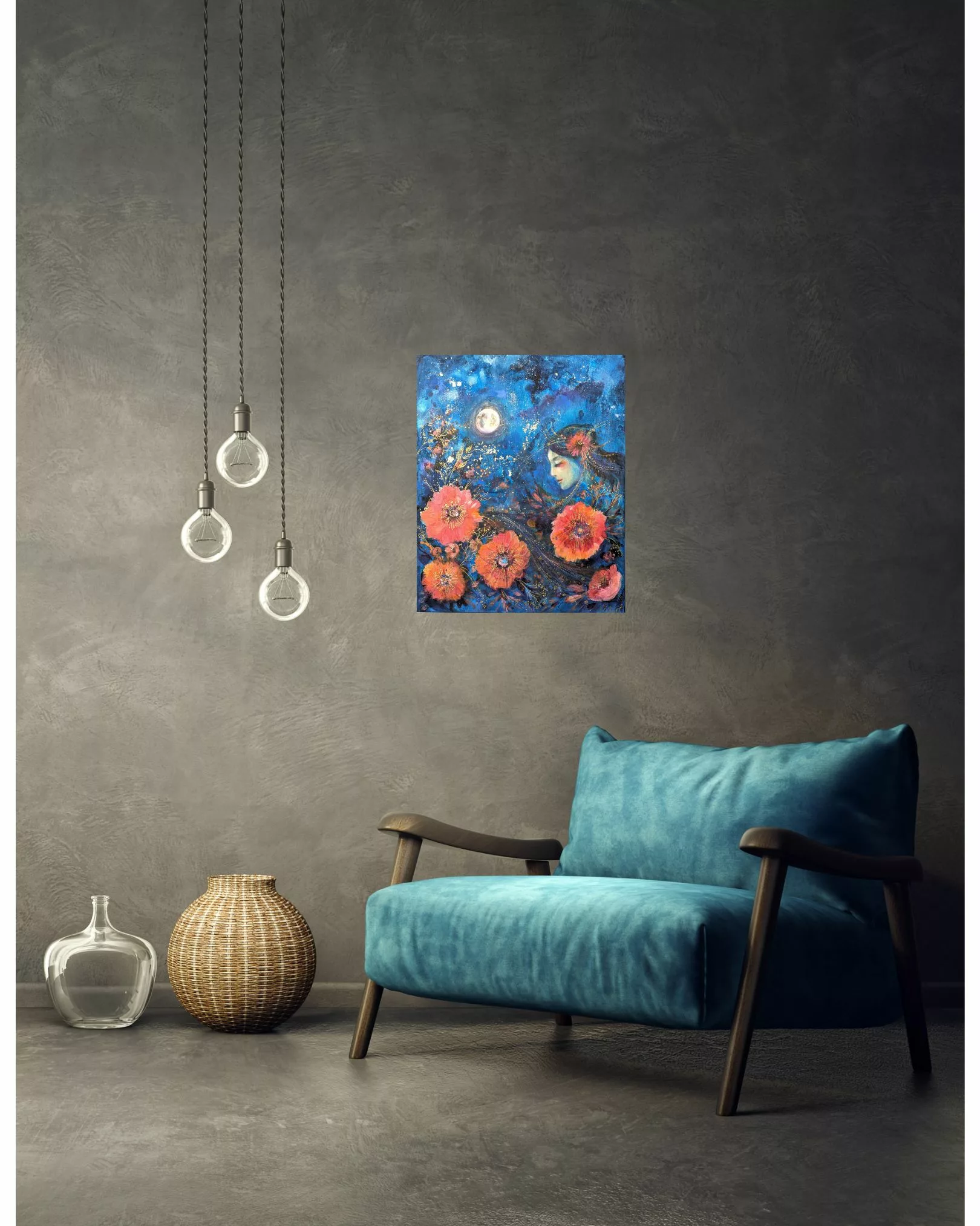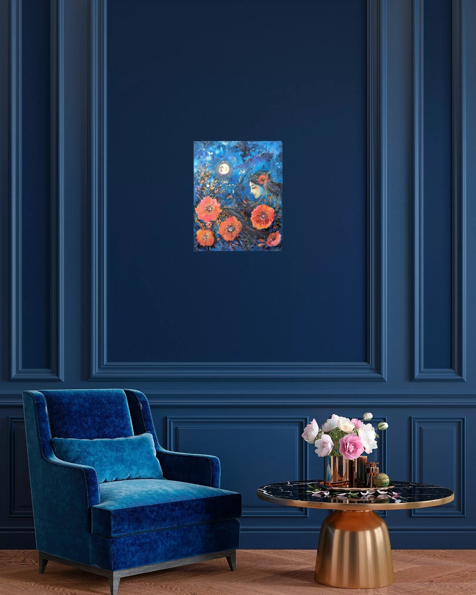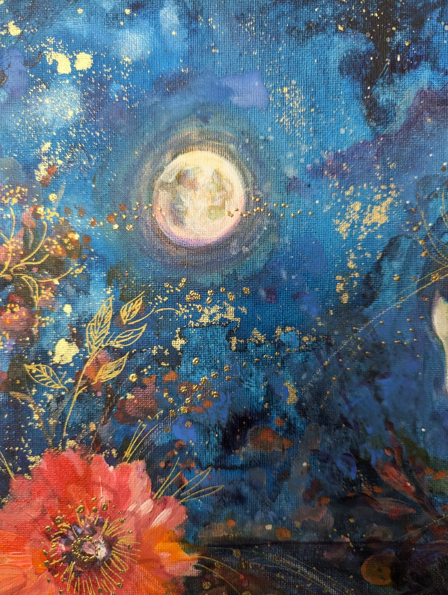 Femme céleste dans un ciel fleuri et étoilé. Eclats de rêves.