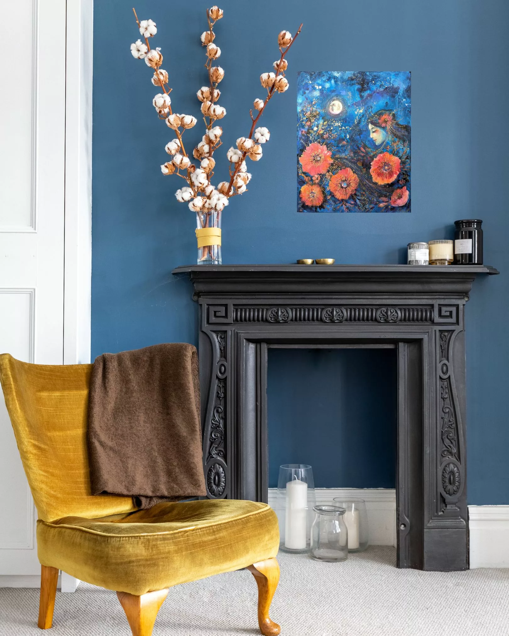 Esprit onirique et romantique ponctué de couleurs fortes et contrastées, certains détails sont réalisés à la poudre dorée cuite avec un léger relief.