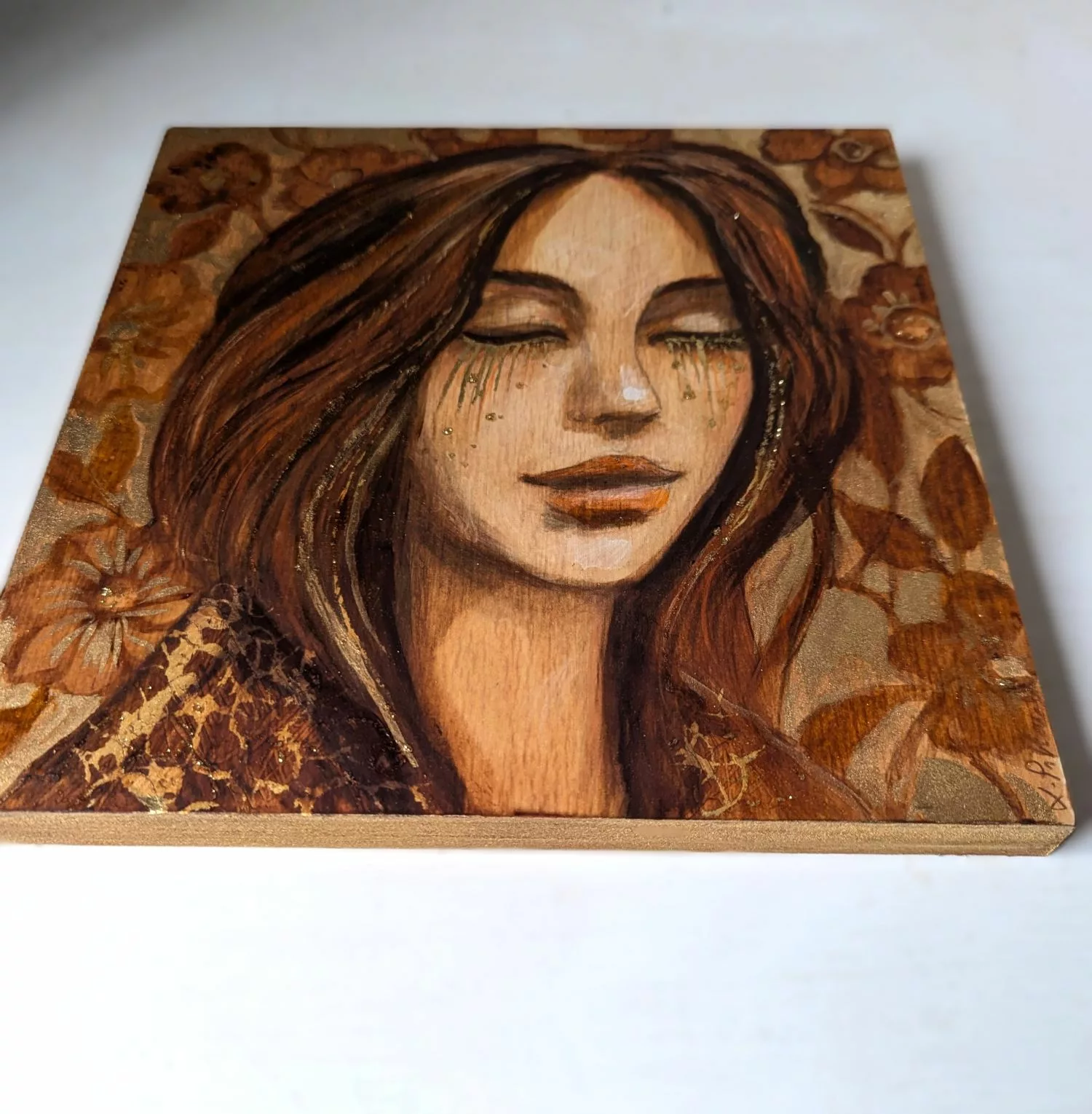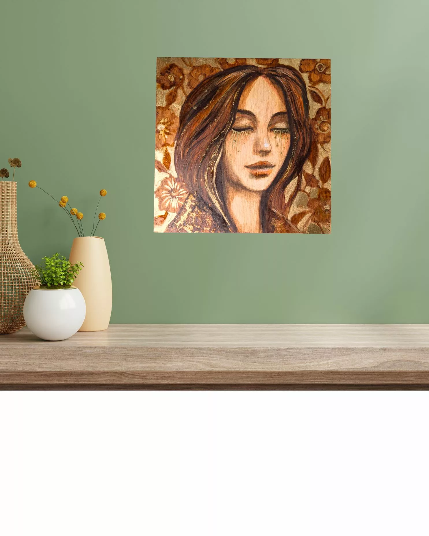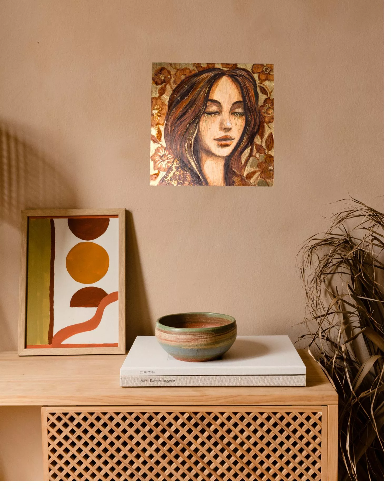 Format carré 25 x 25 cm et épaisseur 2 cm. L’œuvre est vernie, prête à être accrochée et livrée dans un emballage cadeau prêt à offrir.