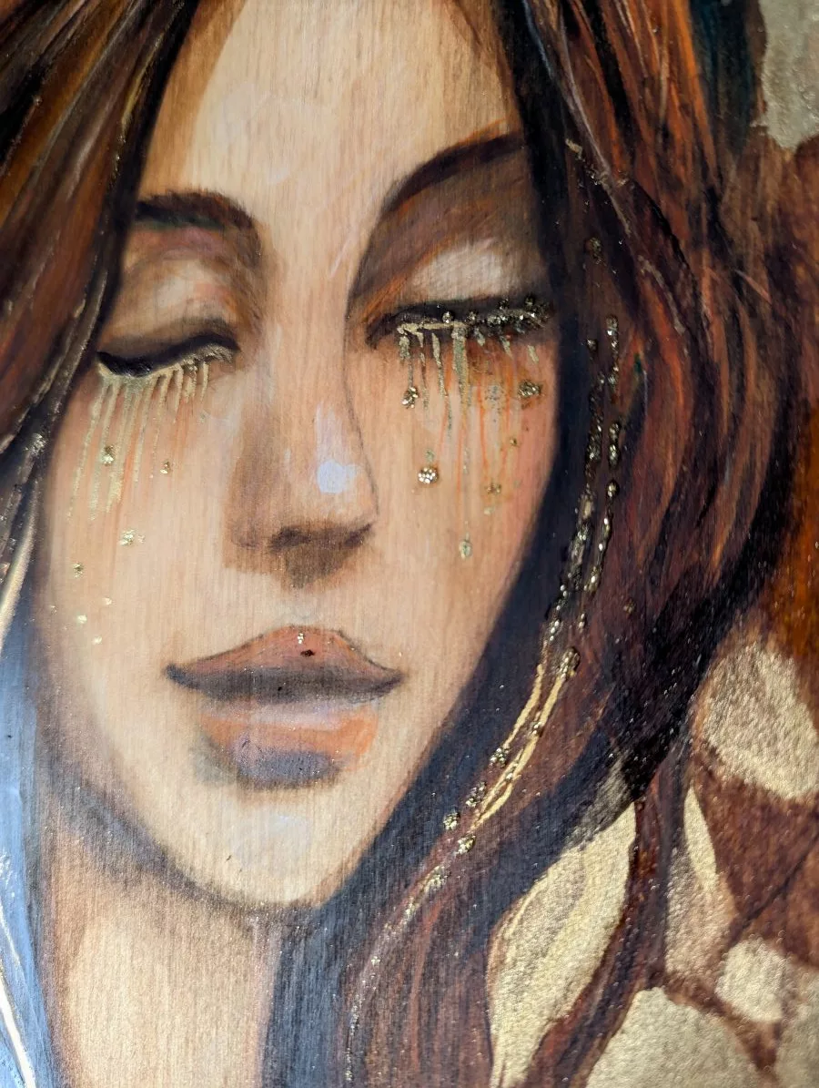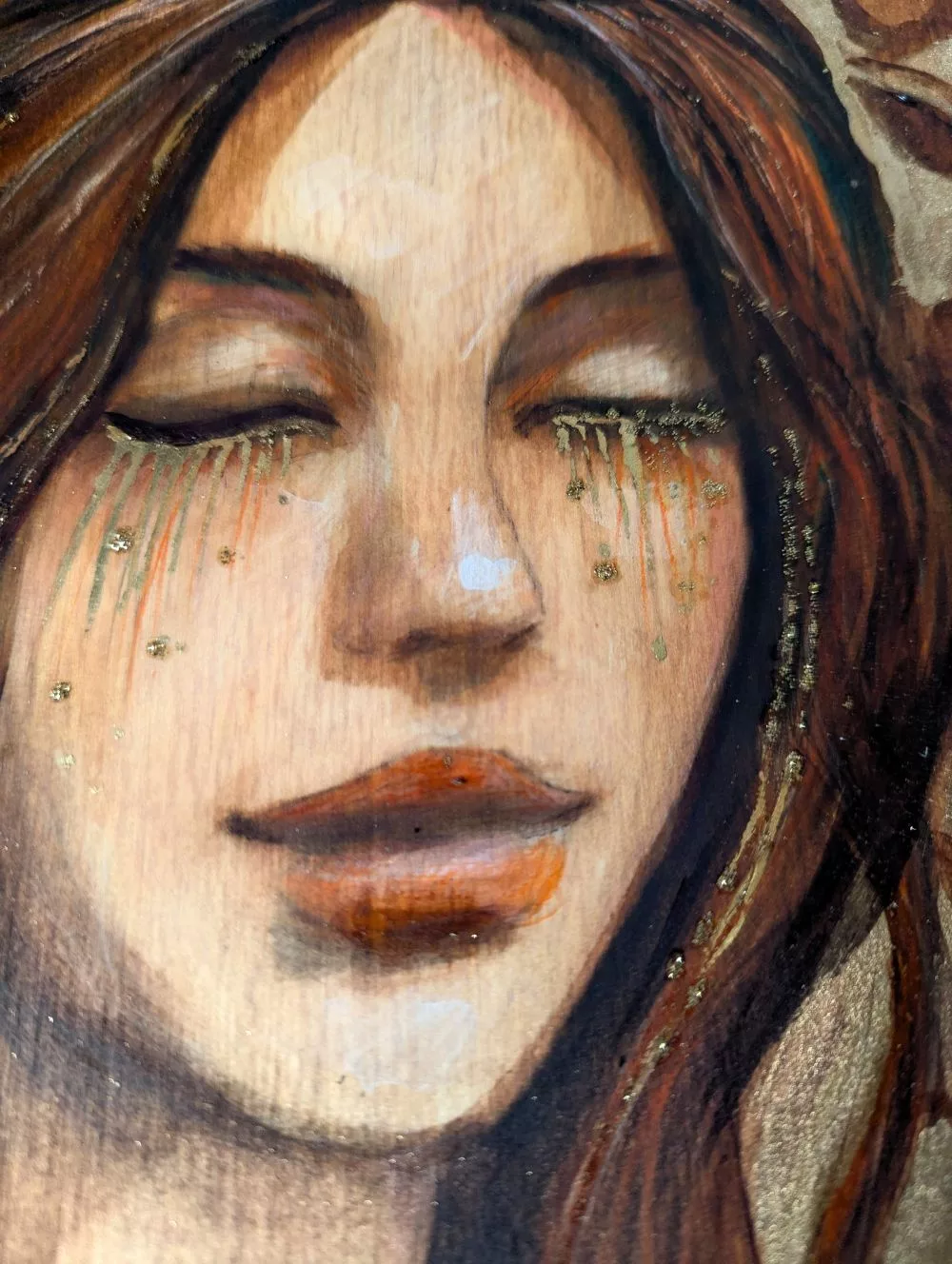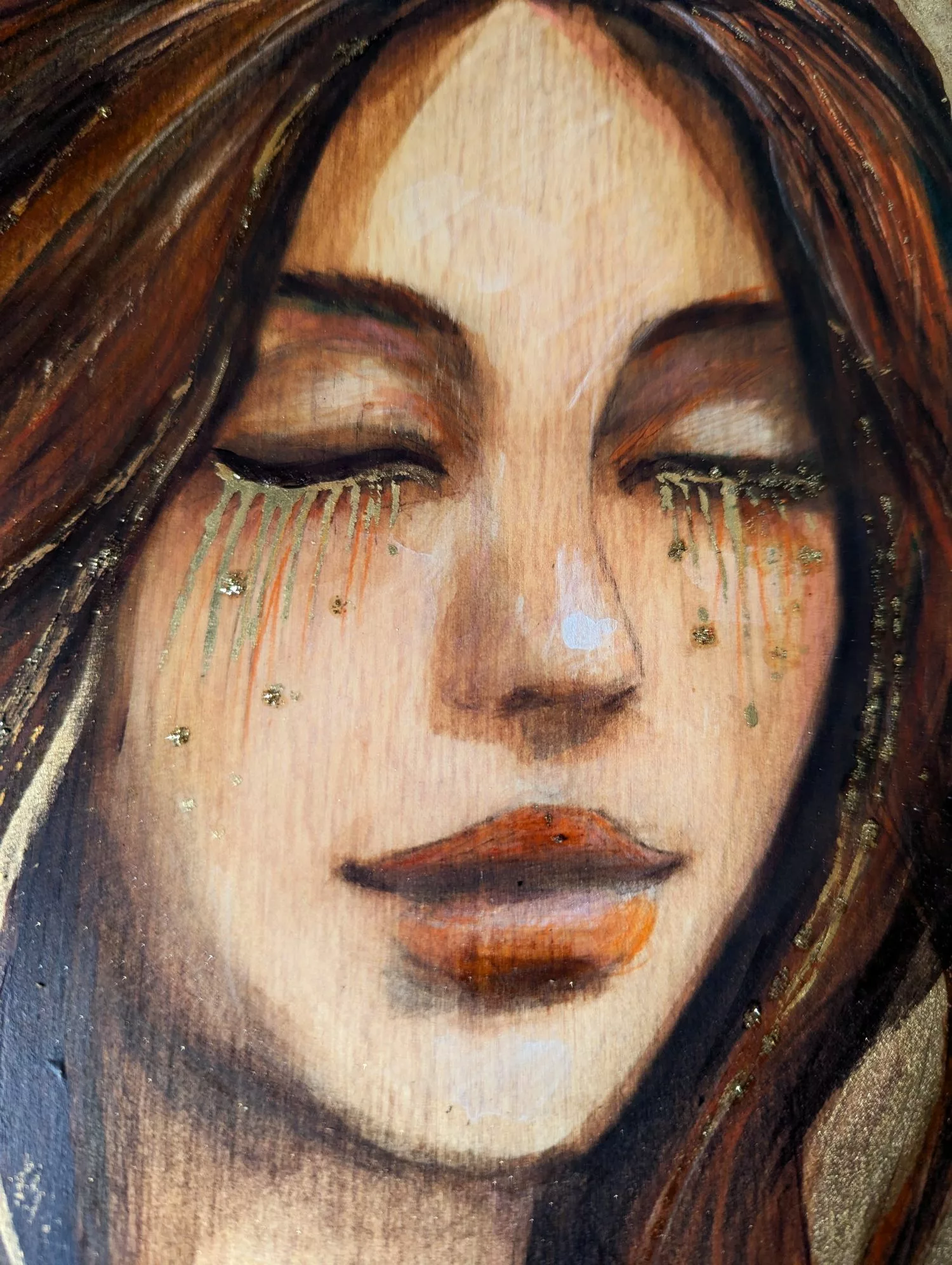 Femme brune aux yeux clos ornés de larmes d’or comme des émotions heureuses nées de jolis souvenirs.