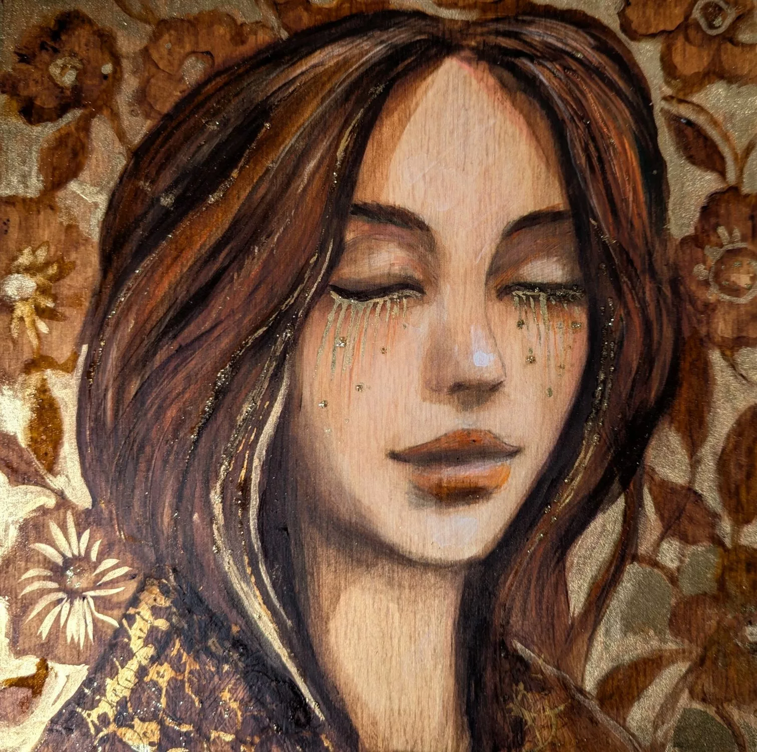 Acrylique, feuille d’or, encres et crayon sur bois.