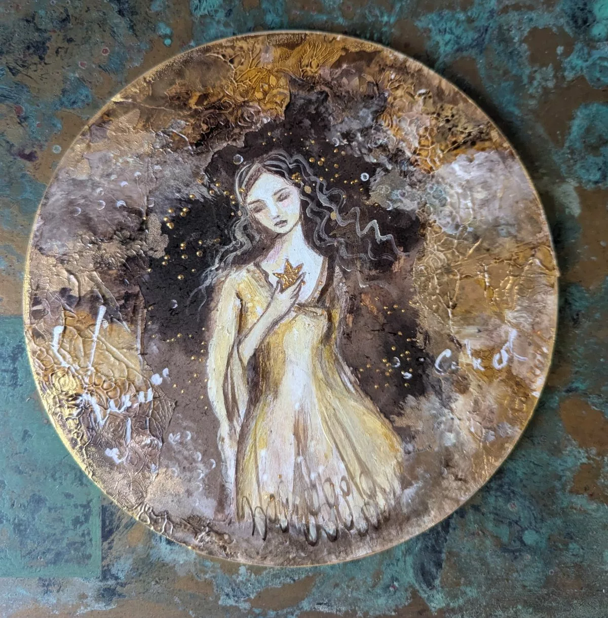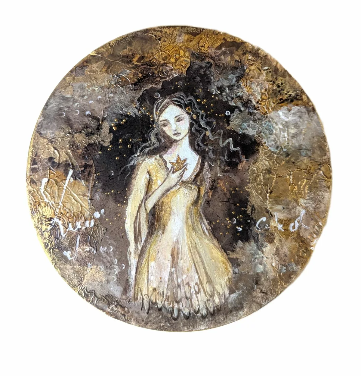 Format rond 20 cm et épaisseur 0.7 cm. L’œuvre est vernie, prête à être accrochée et livrée dans un emballage cadeau prêt à offrir.