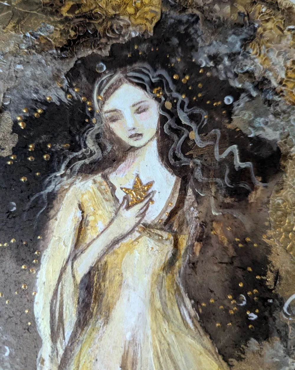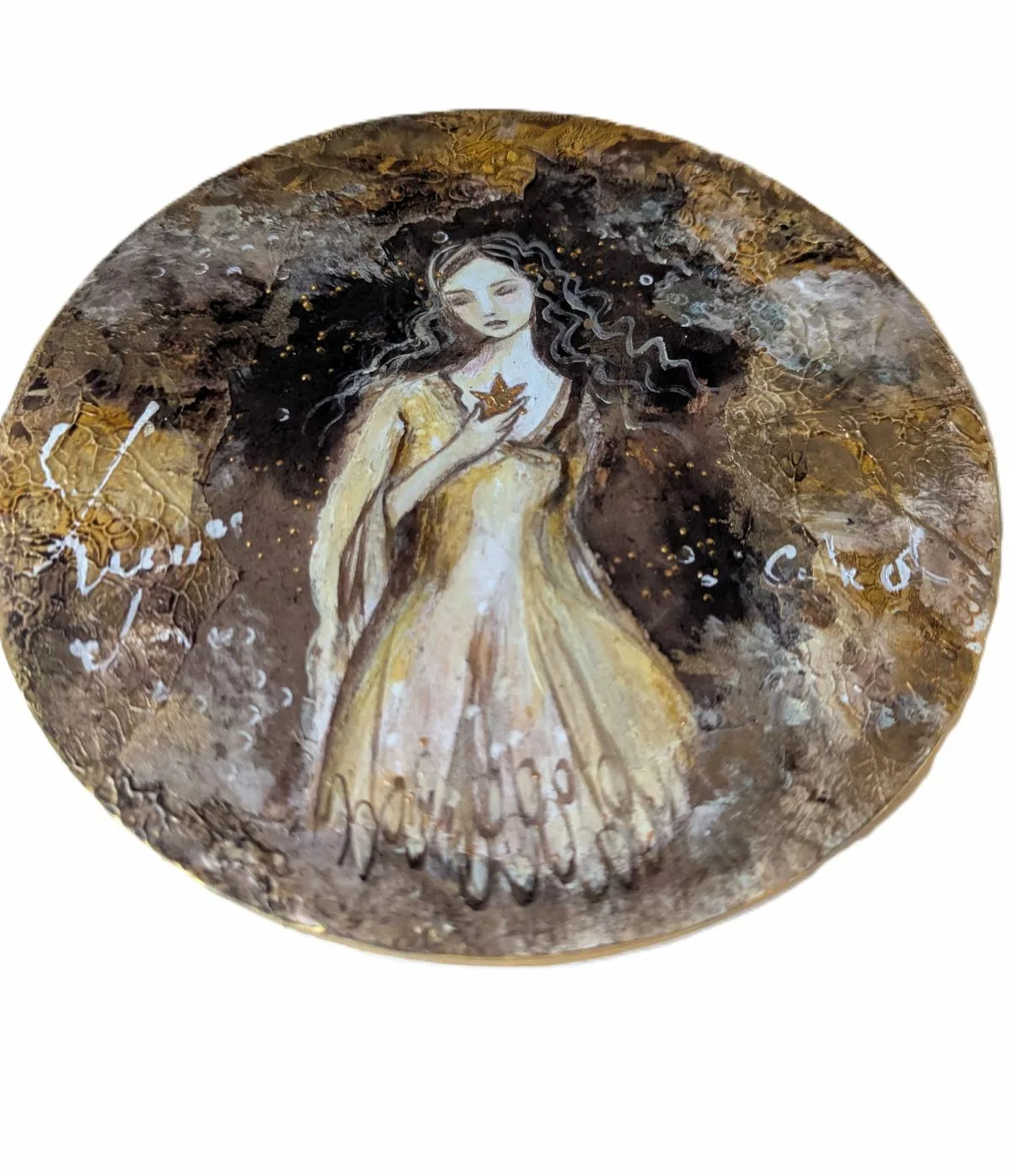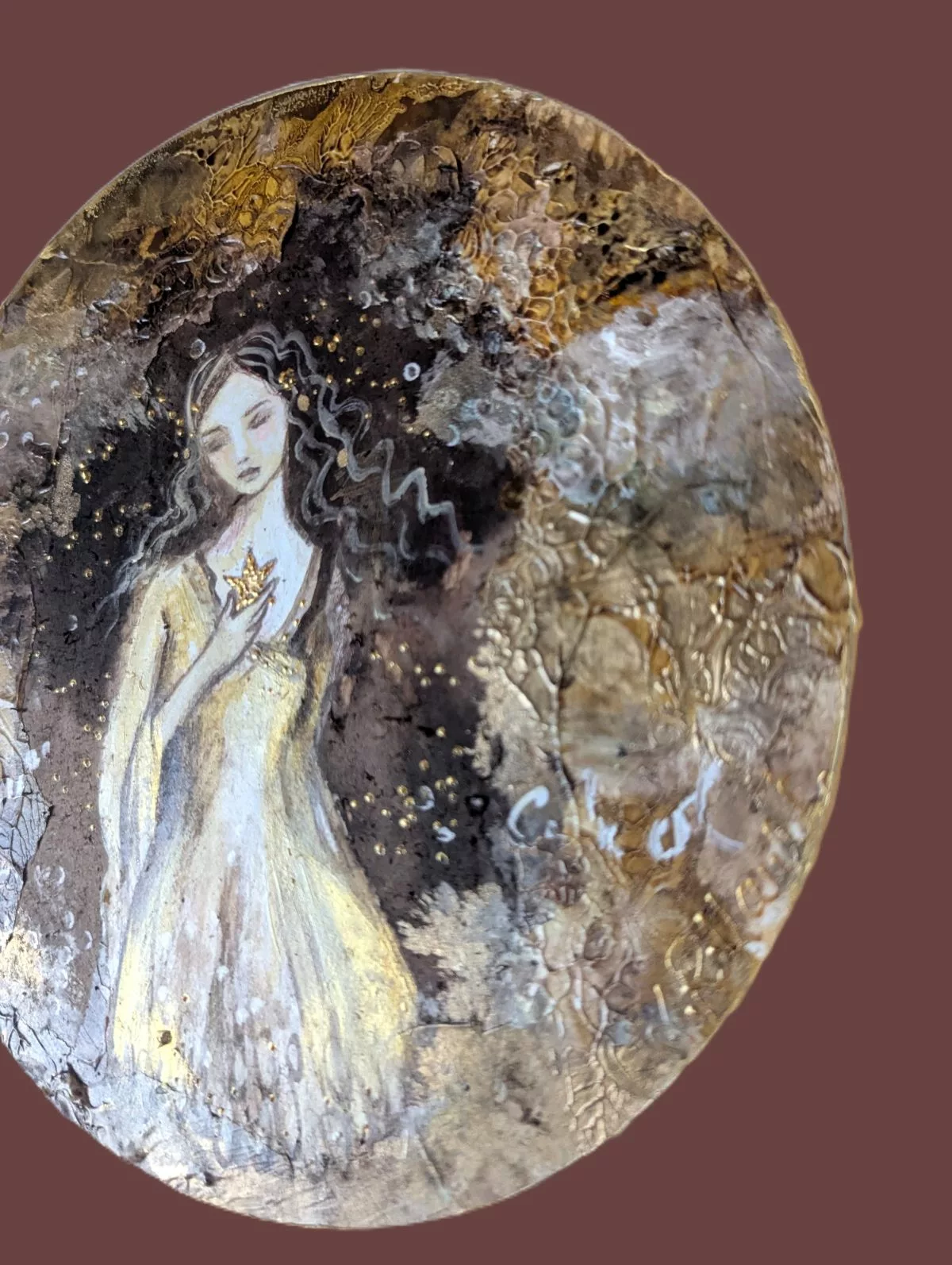 Femme dans un décor brun et or avec des effets de matières et de calligraphie gestuelle.