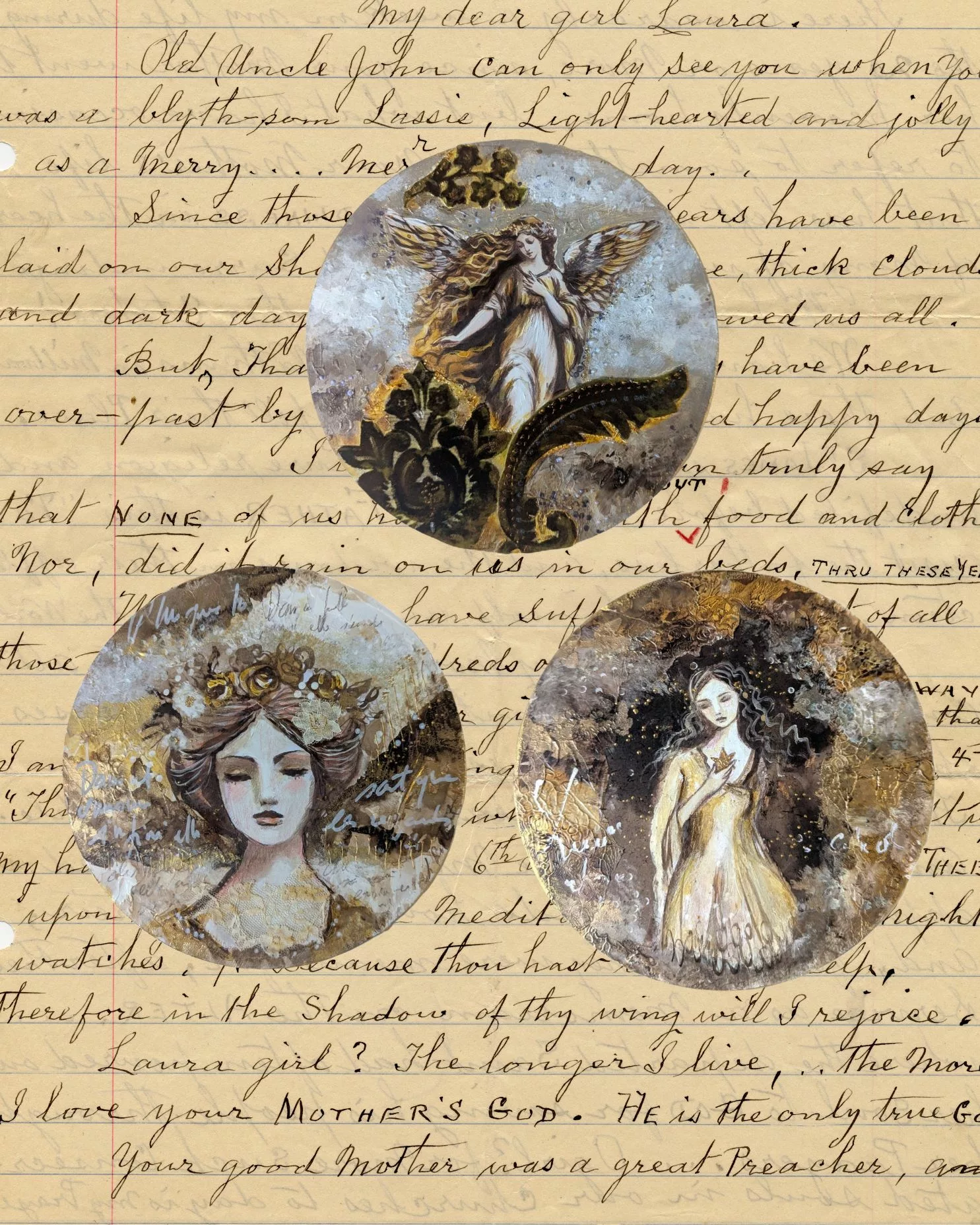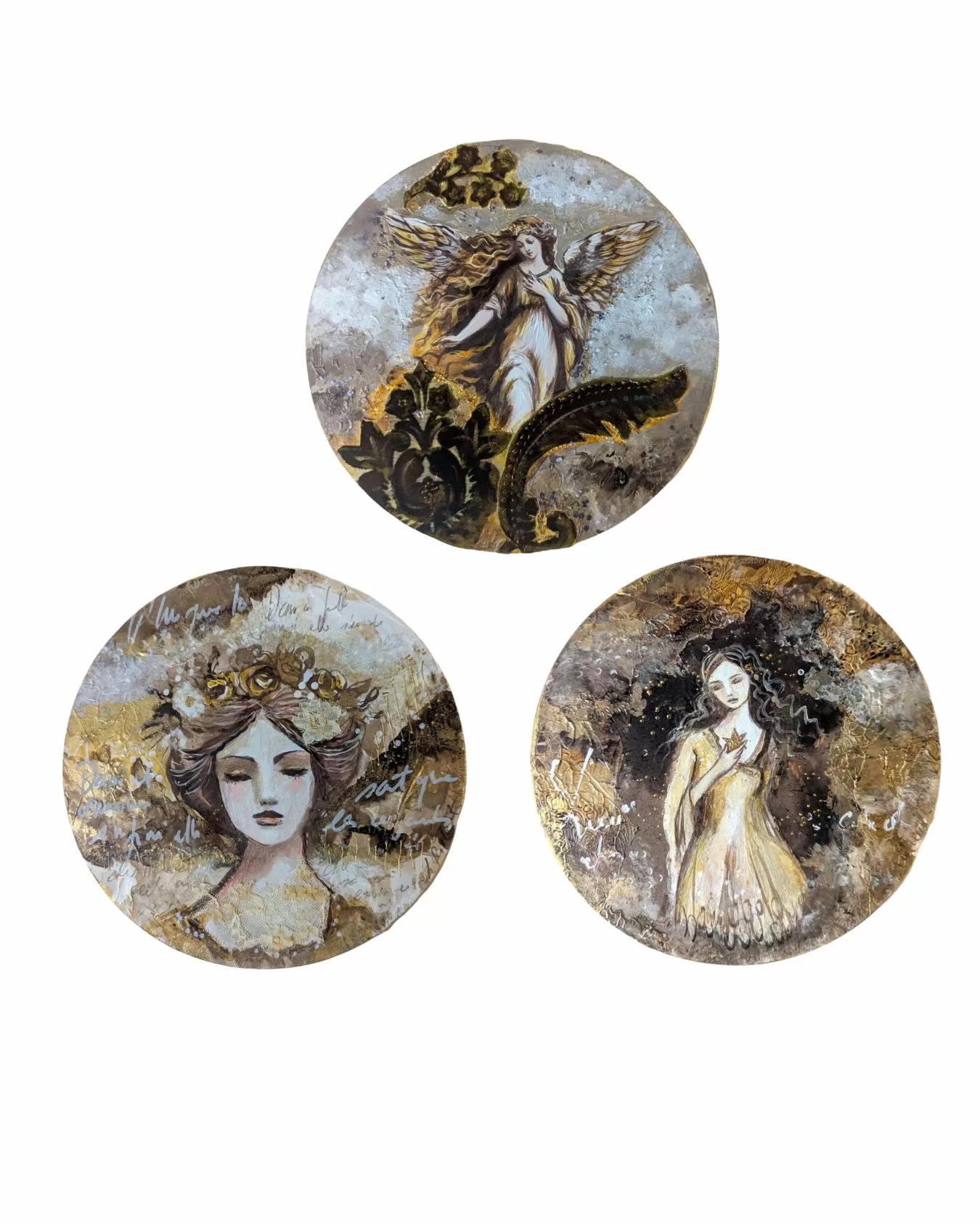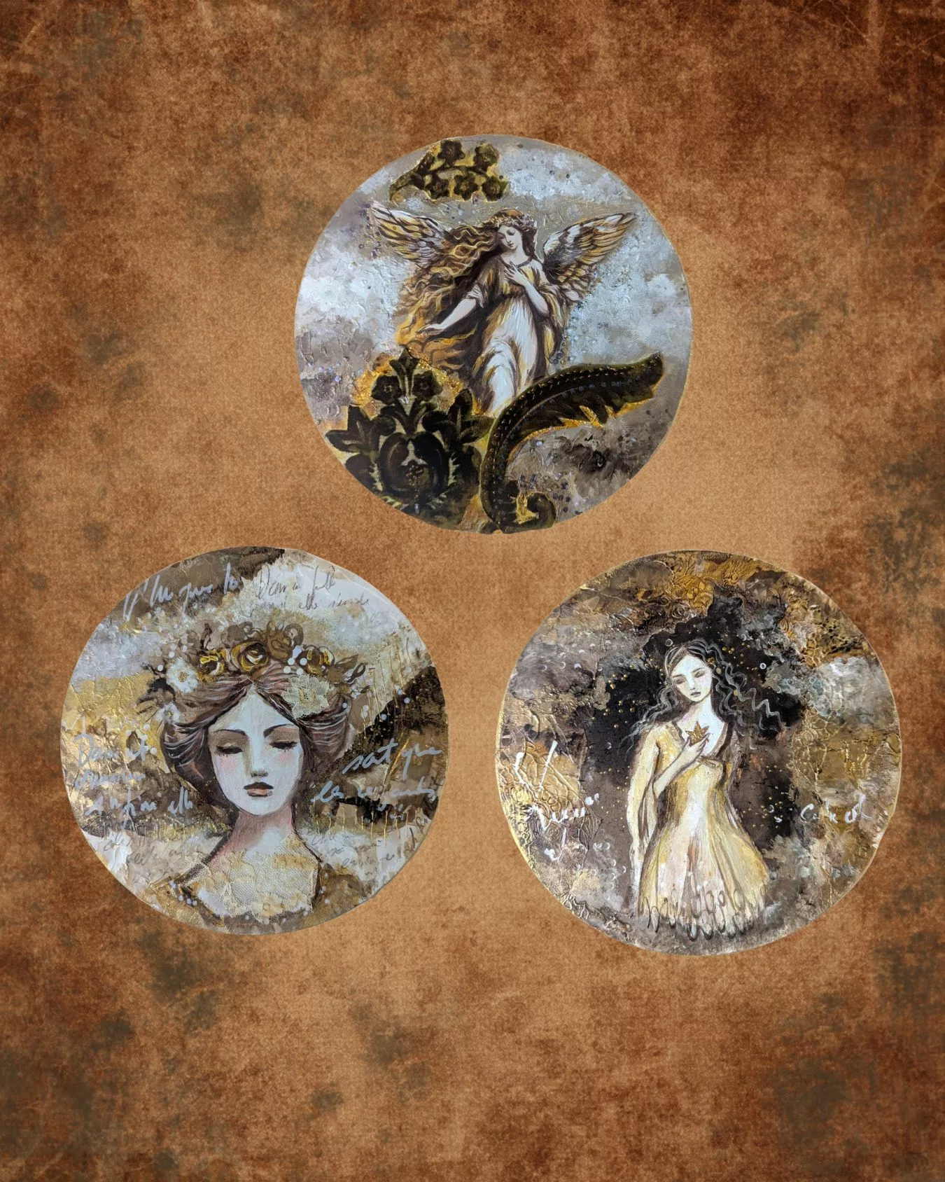 Femme dans un décor brun et or avec des effets de matières et de calligraphie gestuelle.