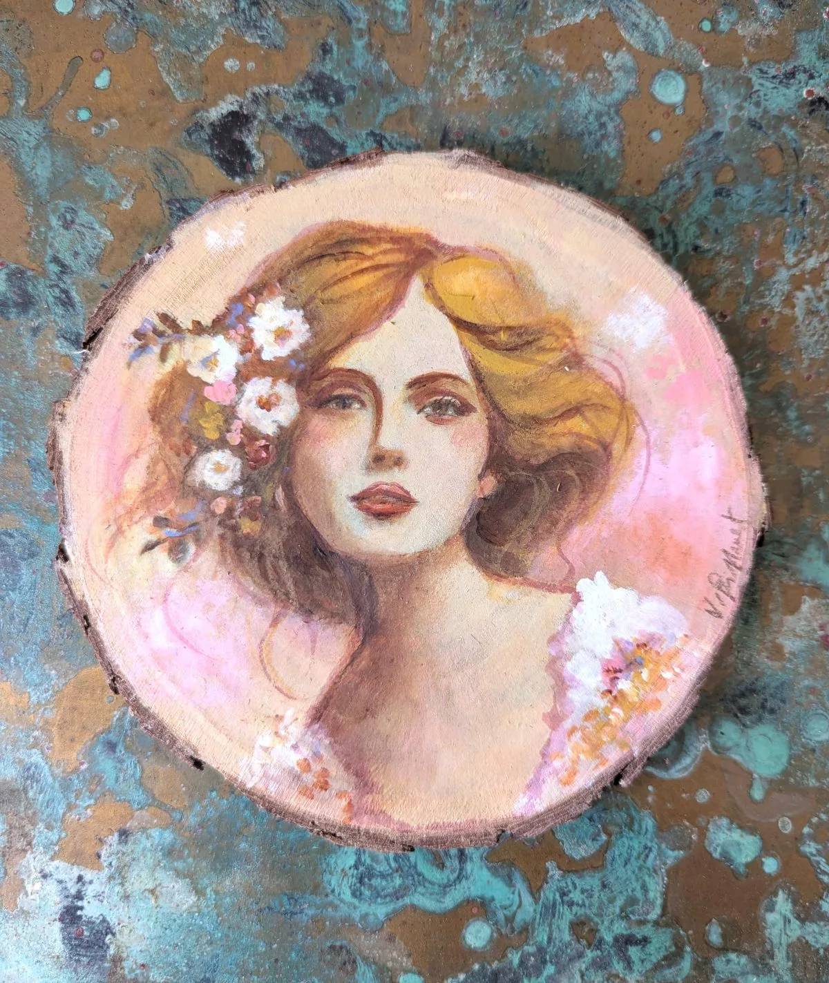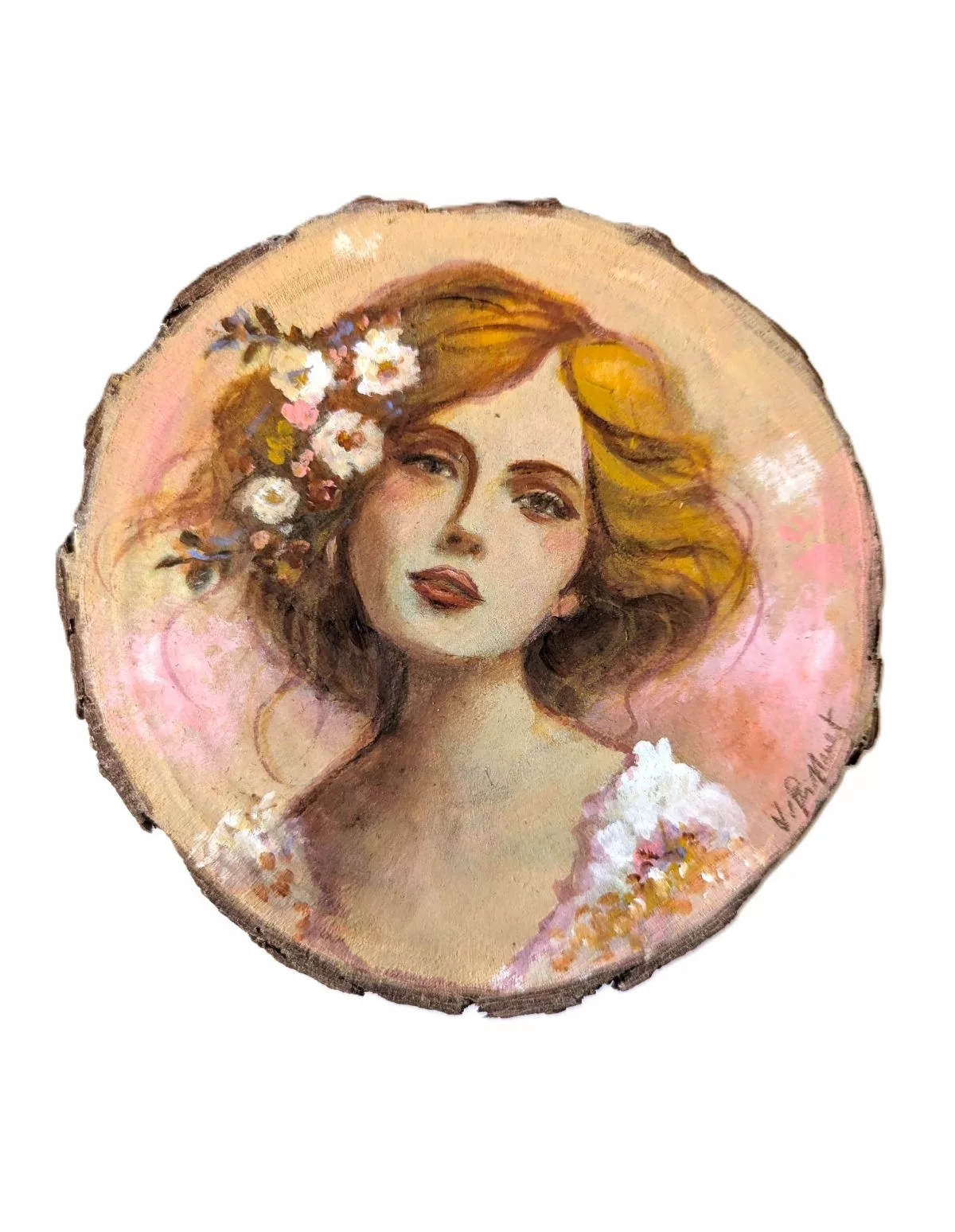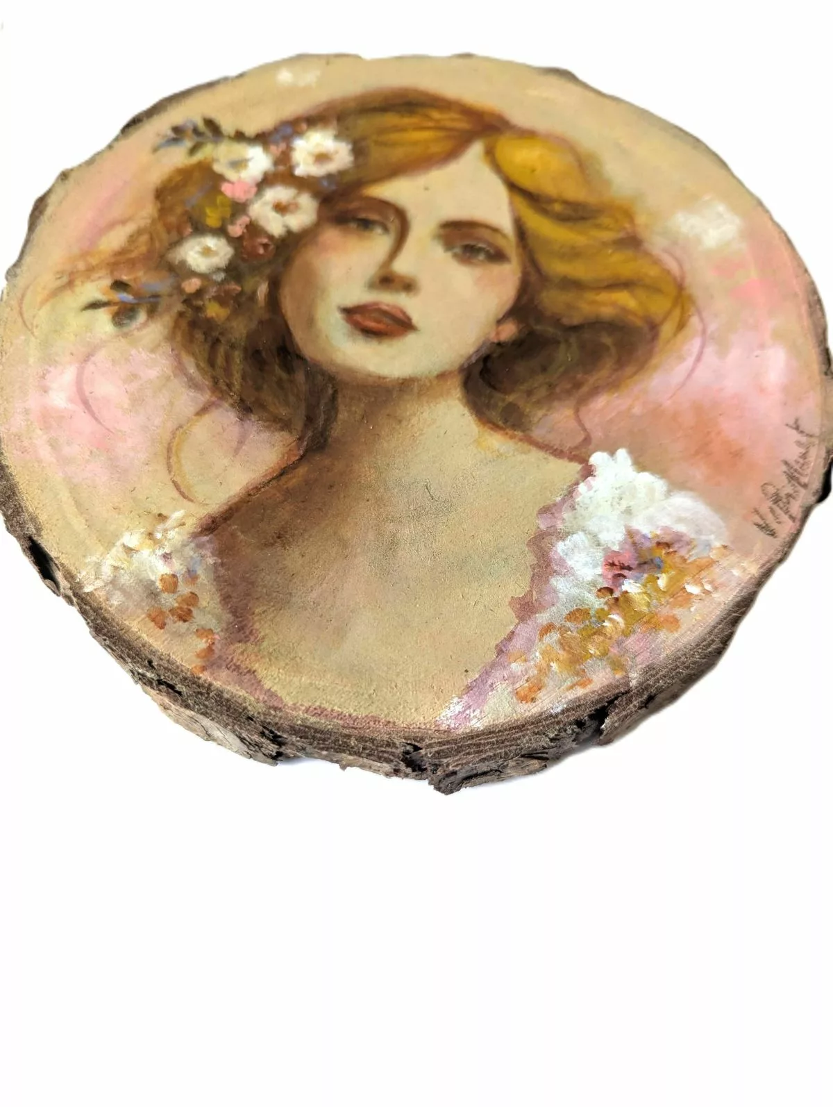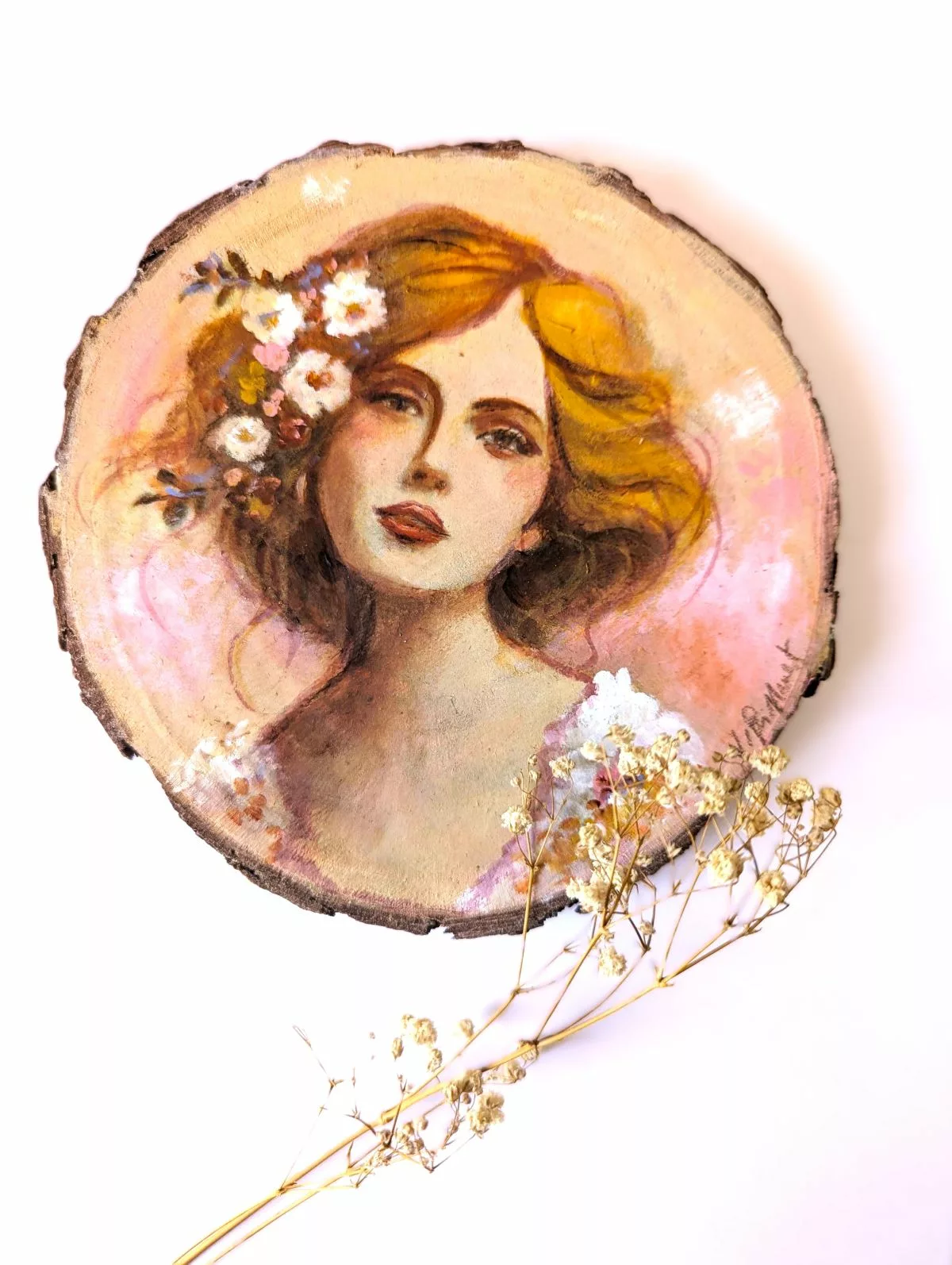 Femme rêveuse douce et romantique à la chevelure ornée de fleurs, acrylique et crayon sur rondin de bois.