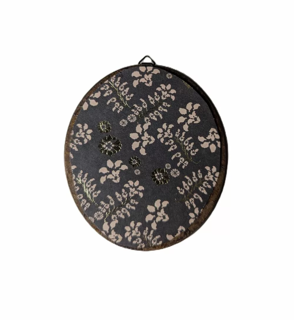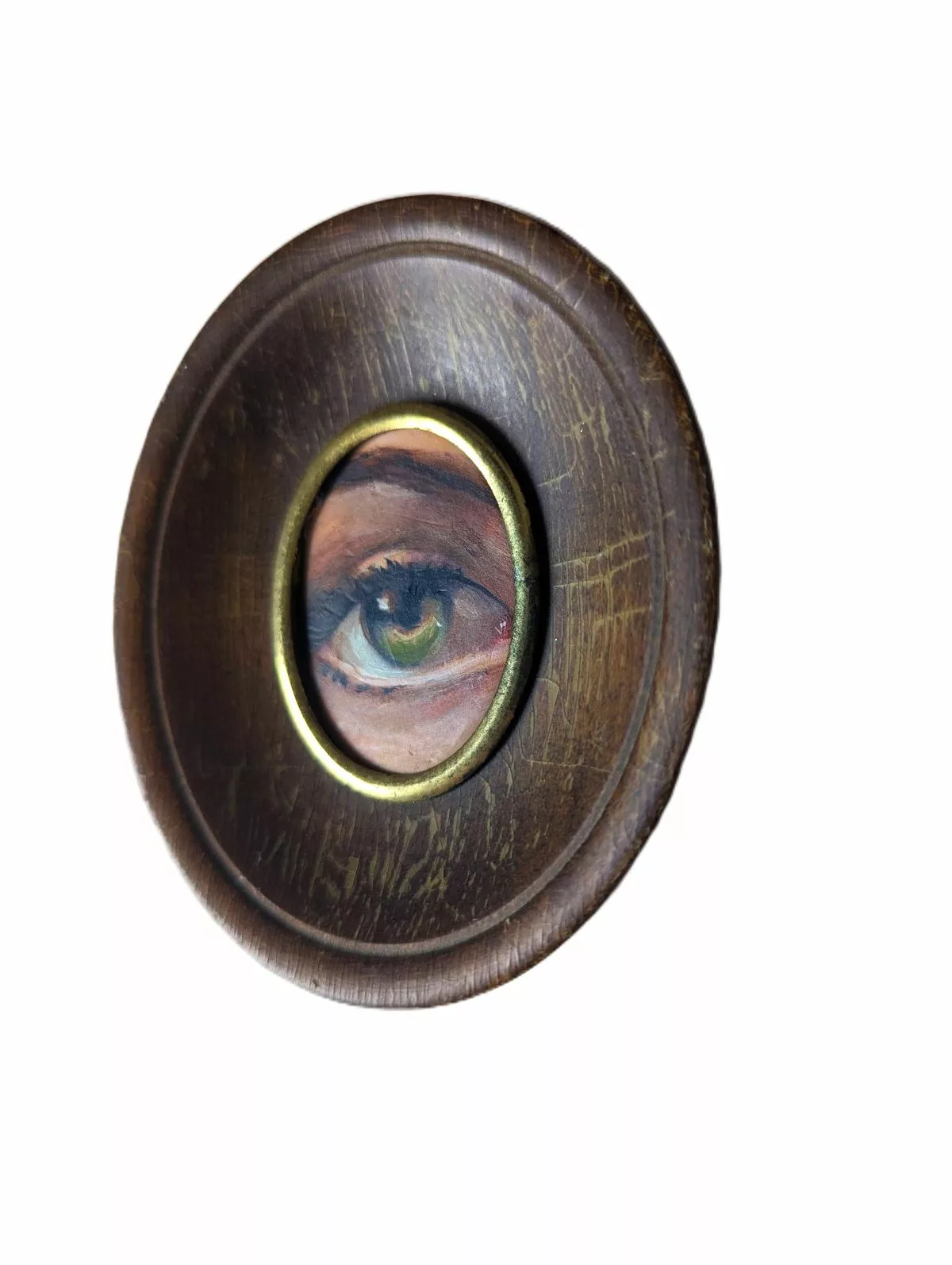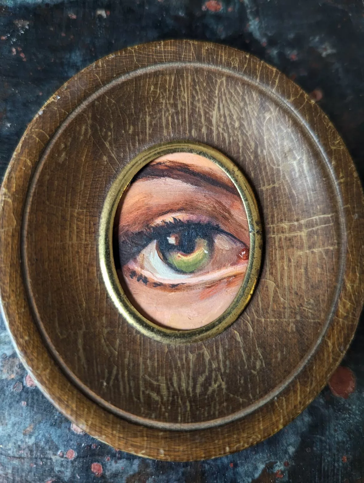 Acrylique et crayon sur bristol avec un cadre ovale ancien en bois et laiton sans verre.