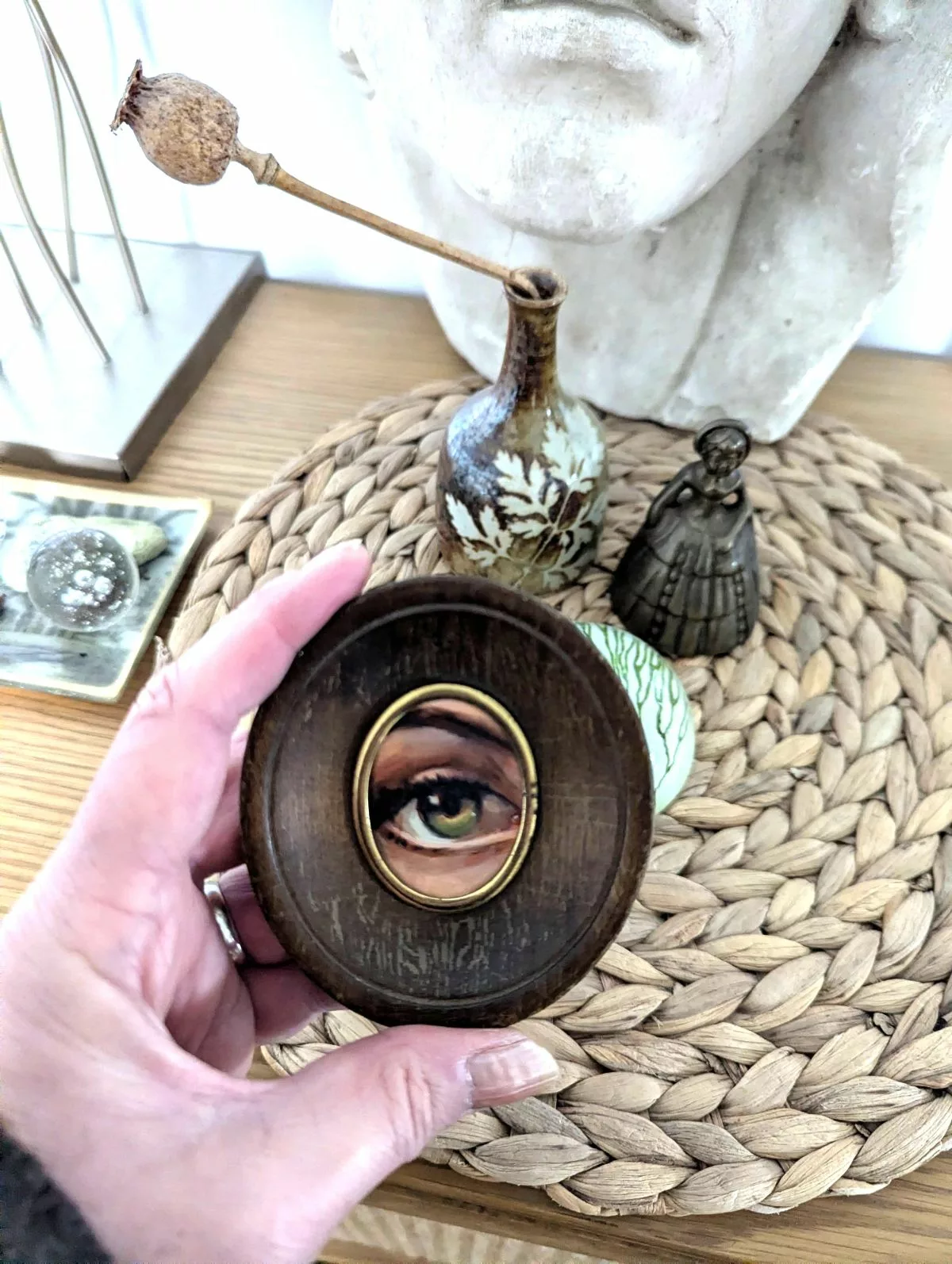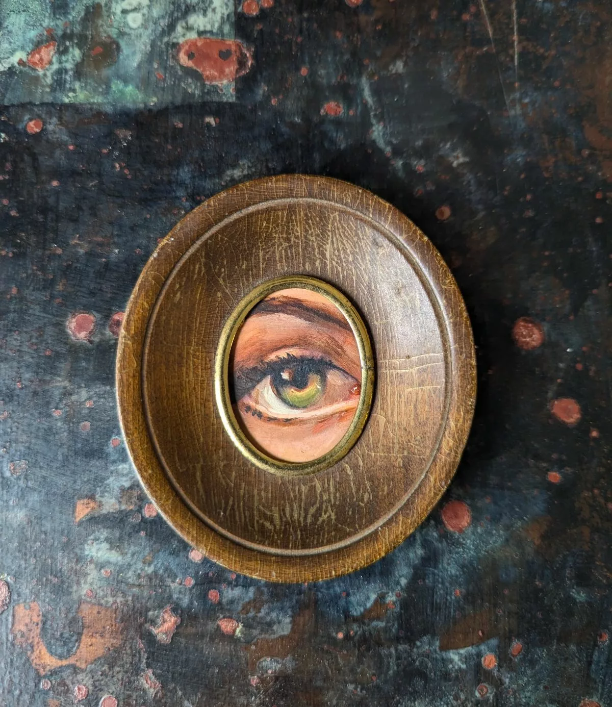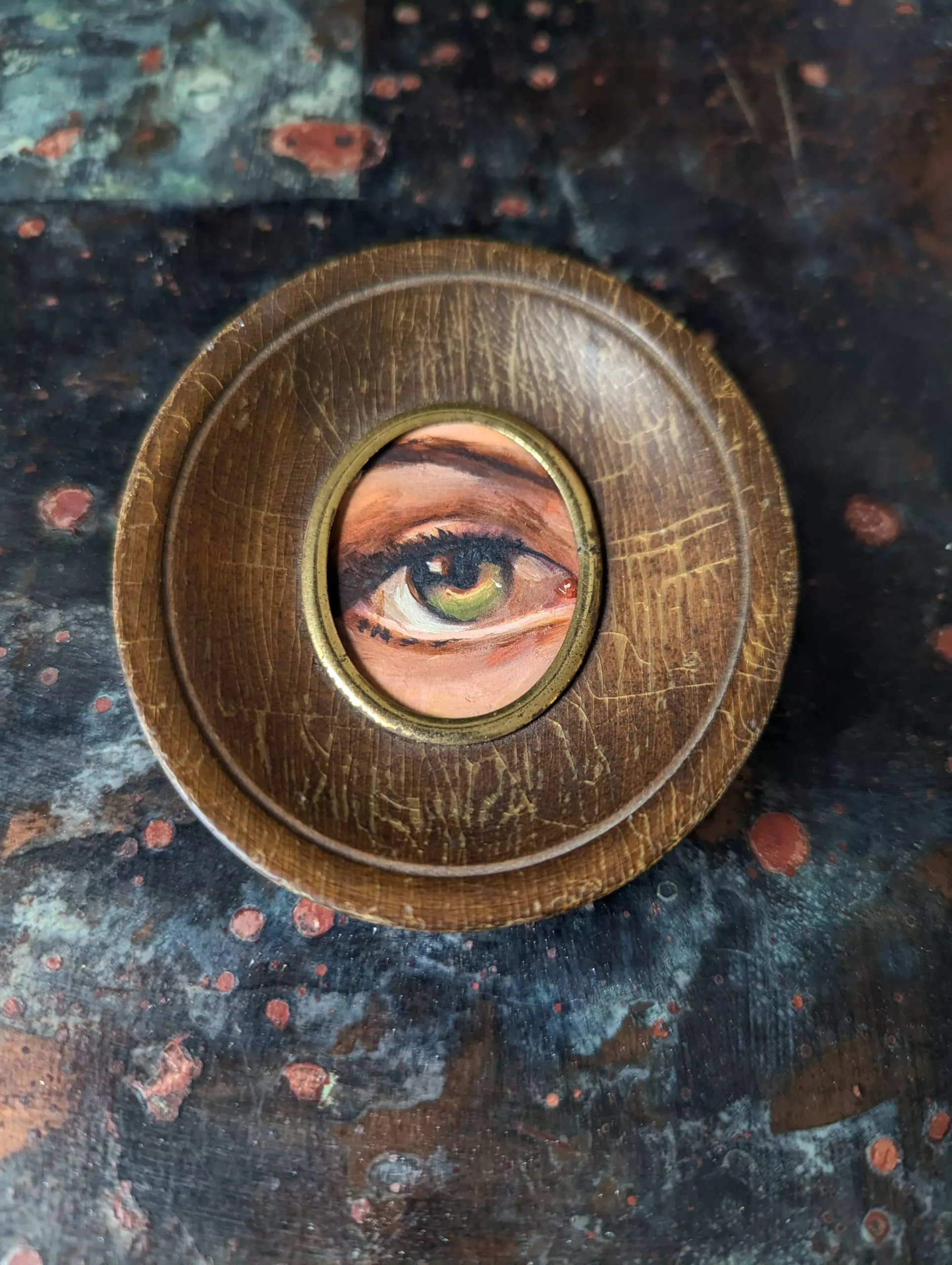 Acrylique et crayon sur bristol avec un cadre ovale ancien en bois et laiton sans verre.