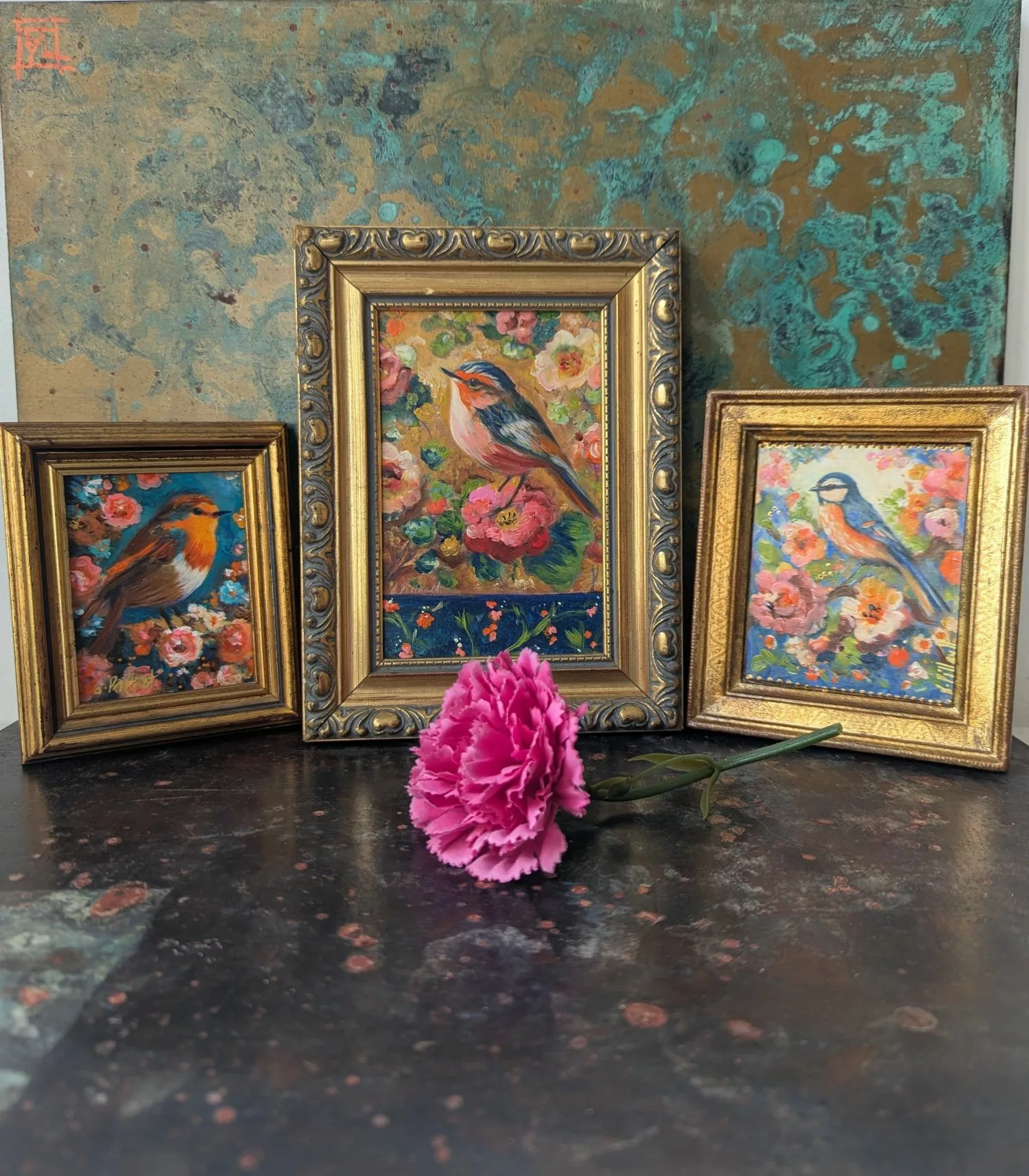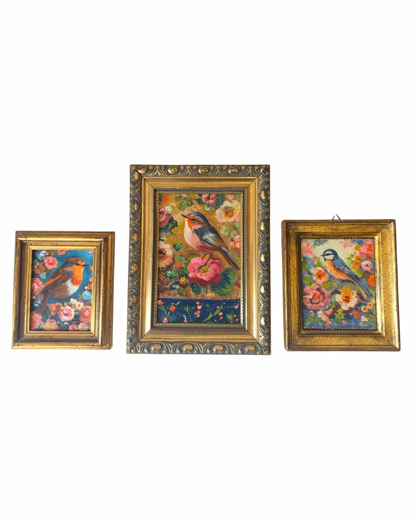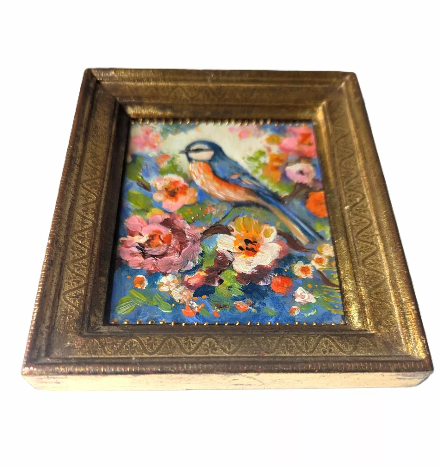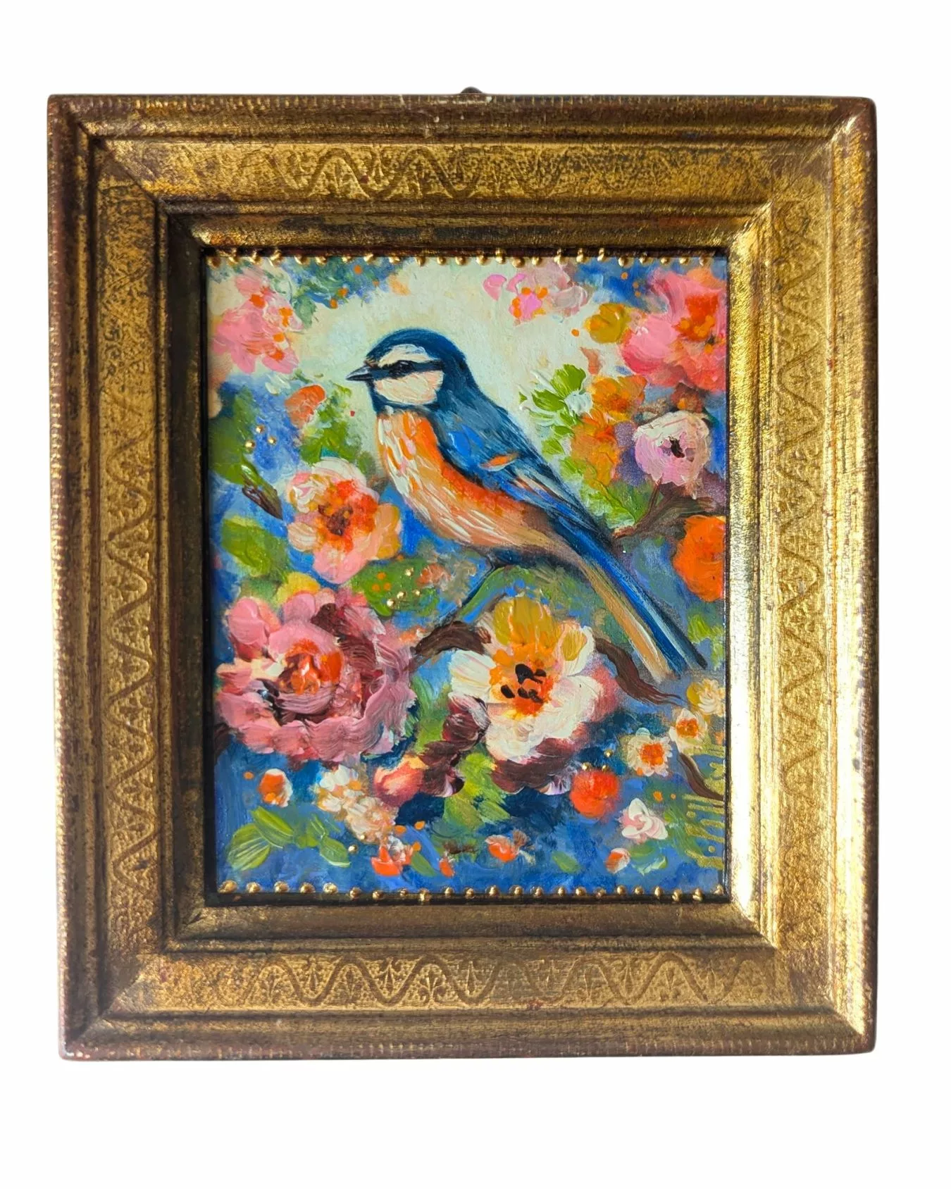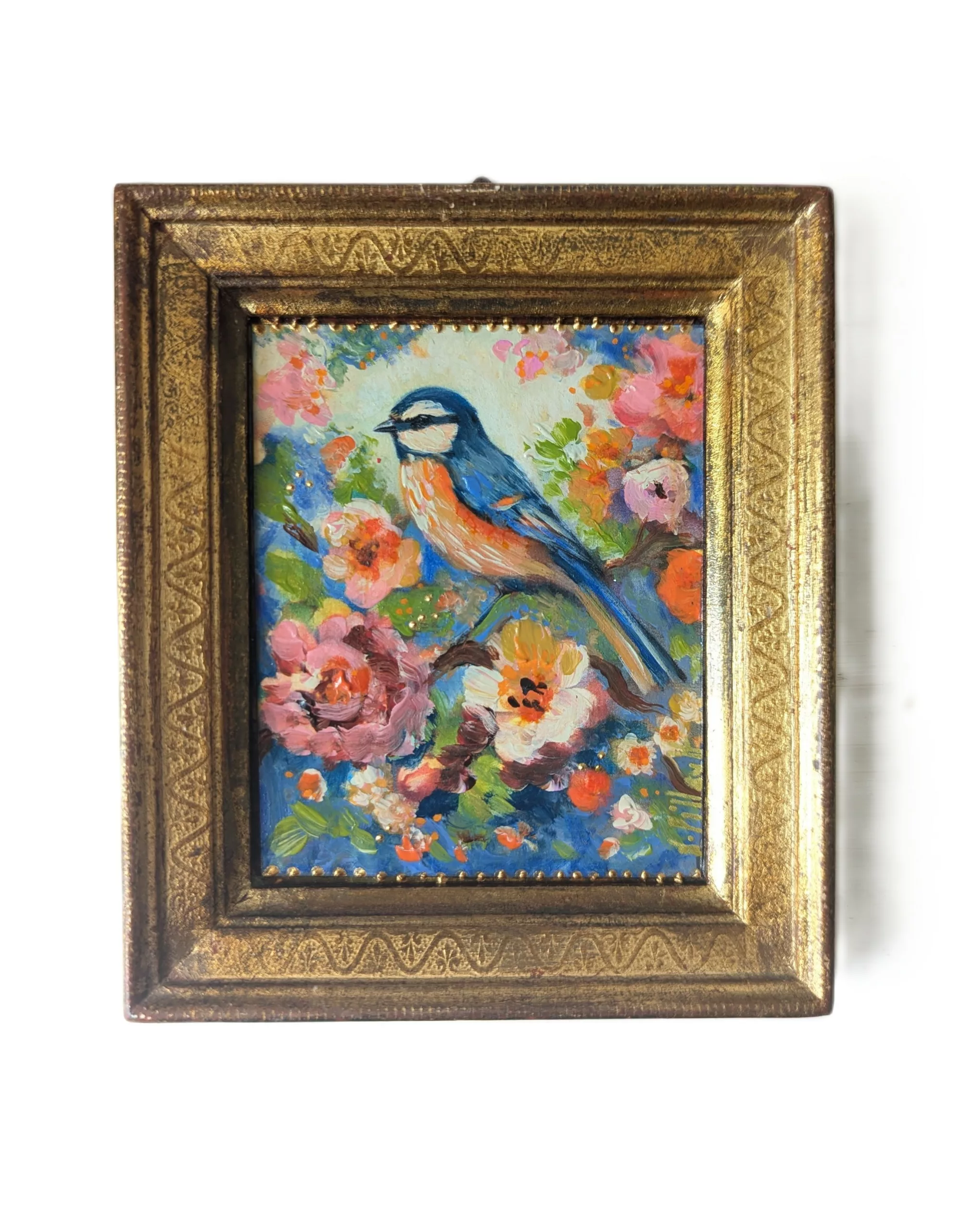Petit oiseau stylisé dans un décor floral romantique et pétillant.