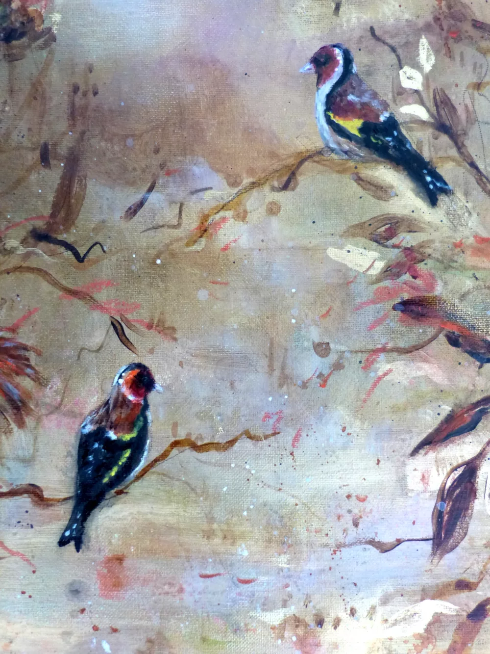 Paysage mordoré avec de nombreux végétaux stylisés en brun, rouge et or. Deux petits chardonnerets prennent place pour un répit poétique.