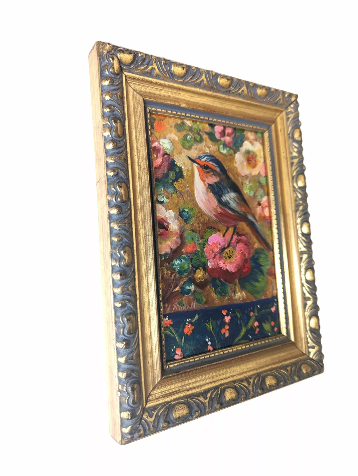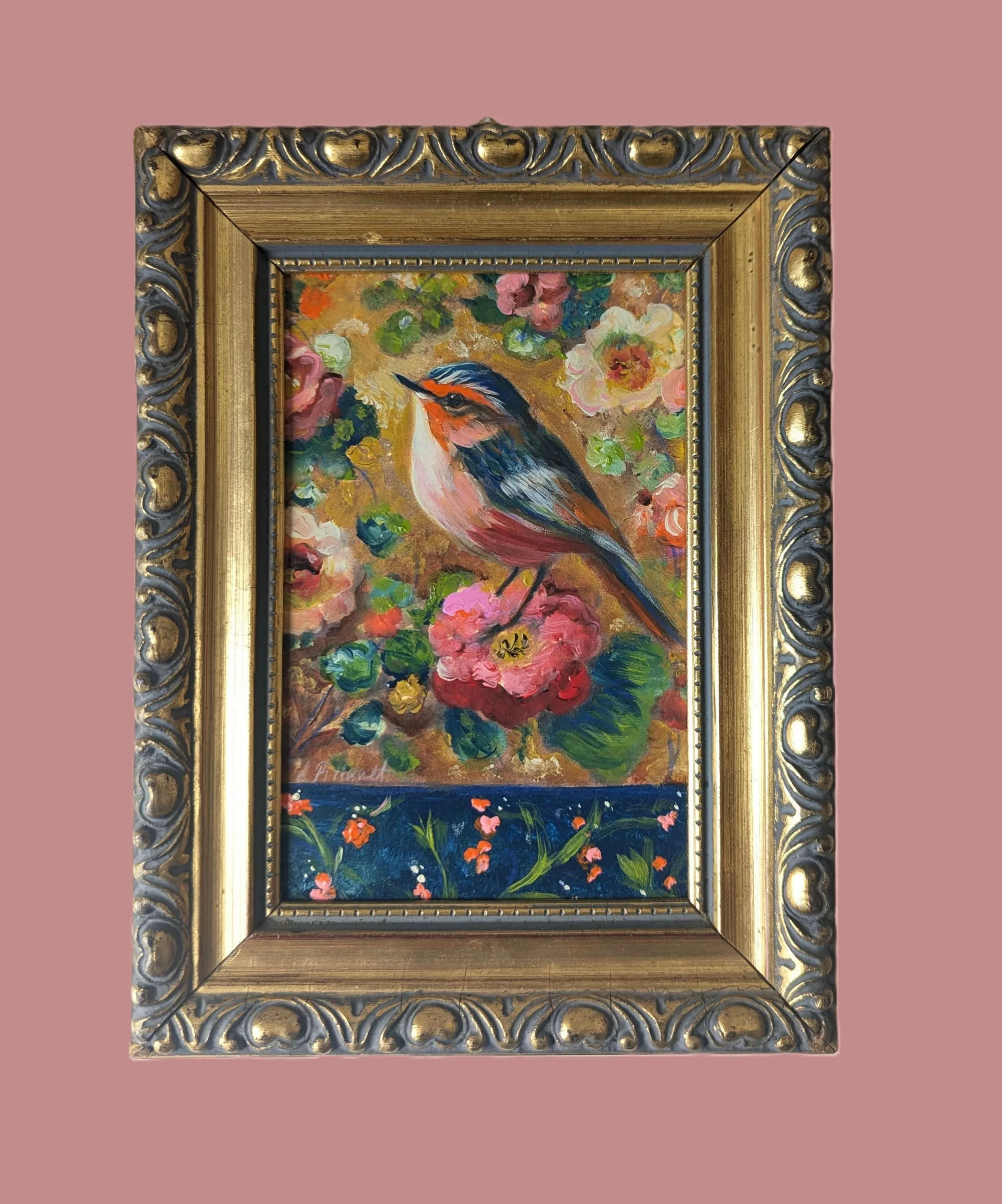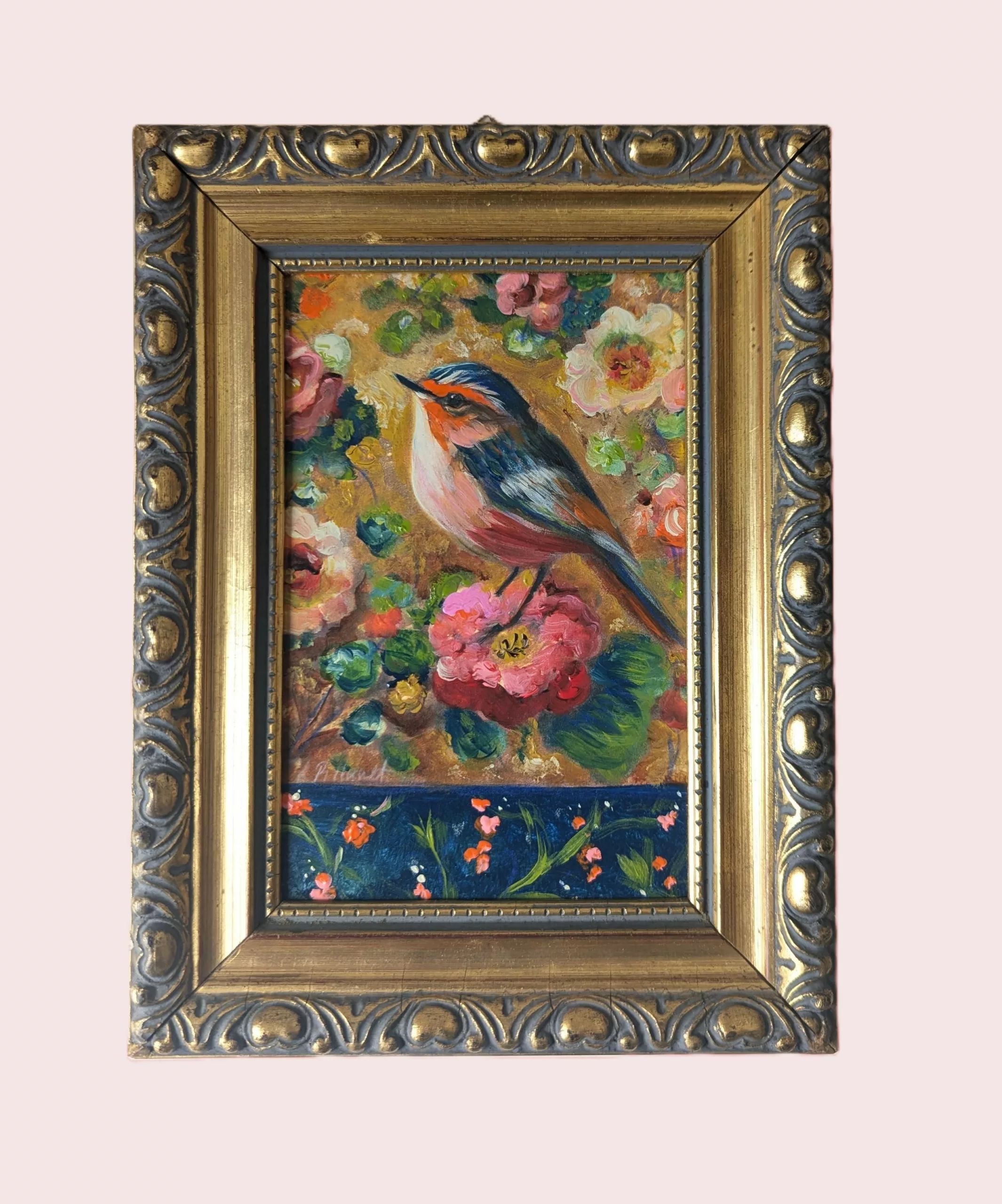 Petit oiseau stylisé dans un décor floral romantique.
