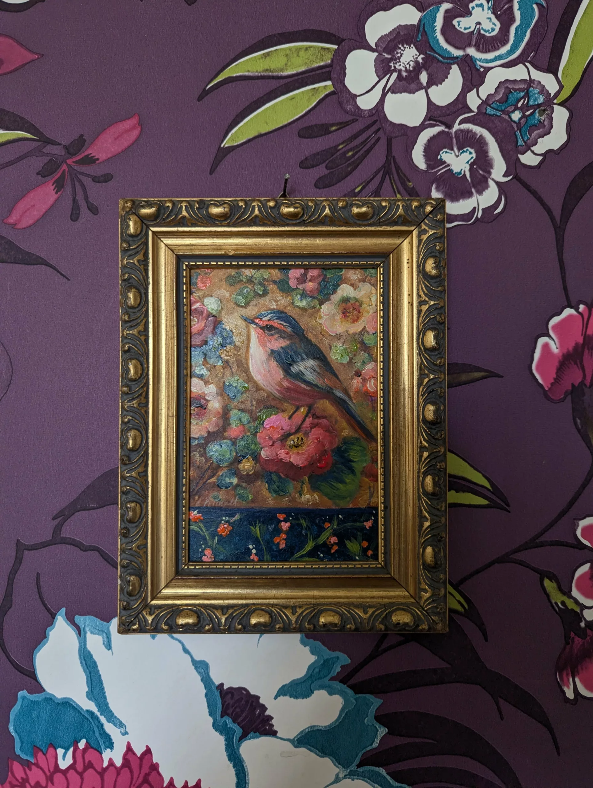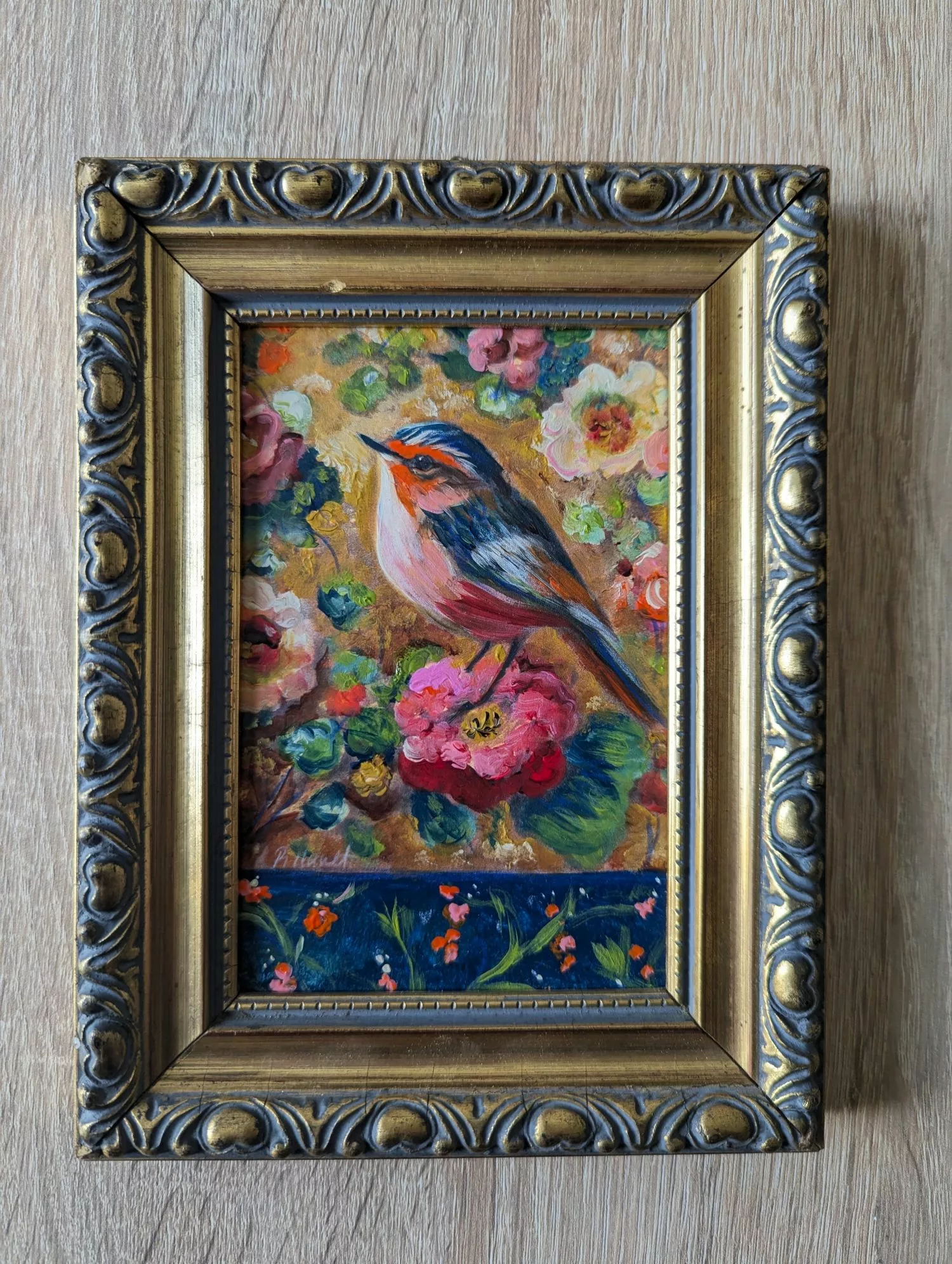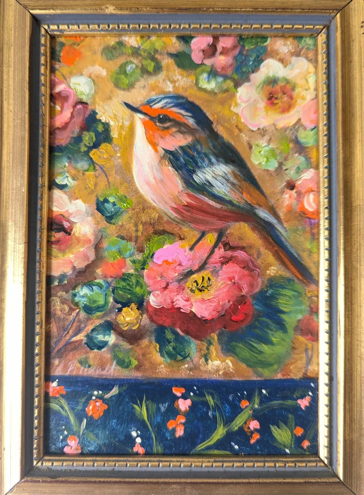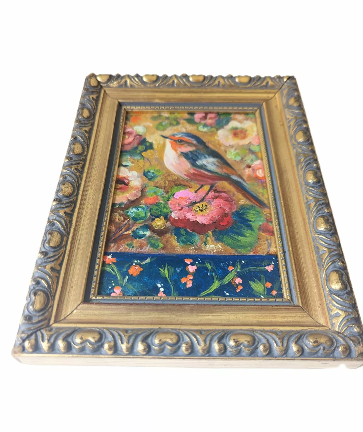Petit oiseau stylisé dans un décor floral romantique.