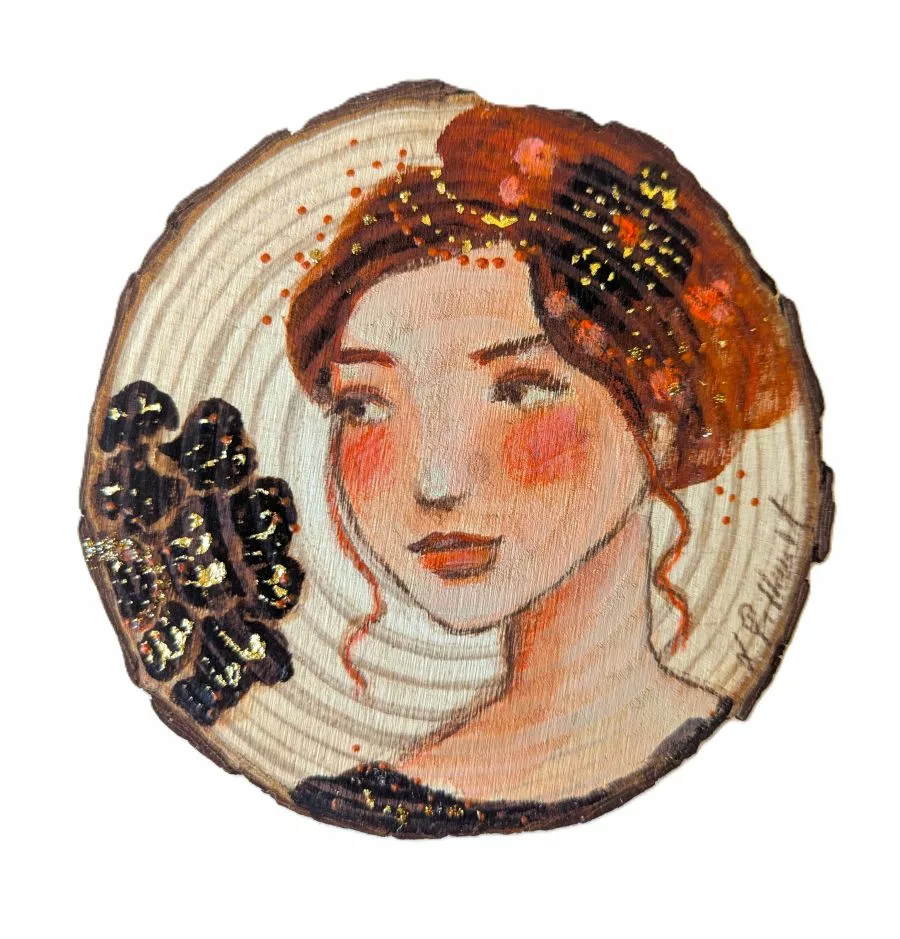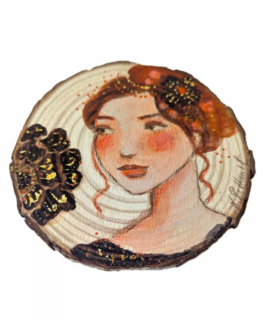 Femme rousse à la chevelure ornée de fleurs et de bijoux rose poudré, brun et or. Le support est un rondin de bois et le fond est laissé brut.