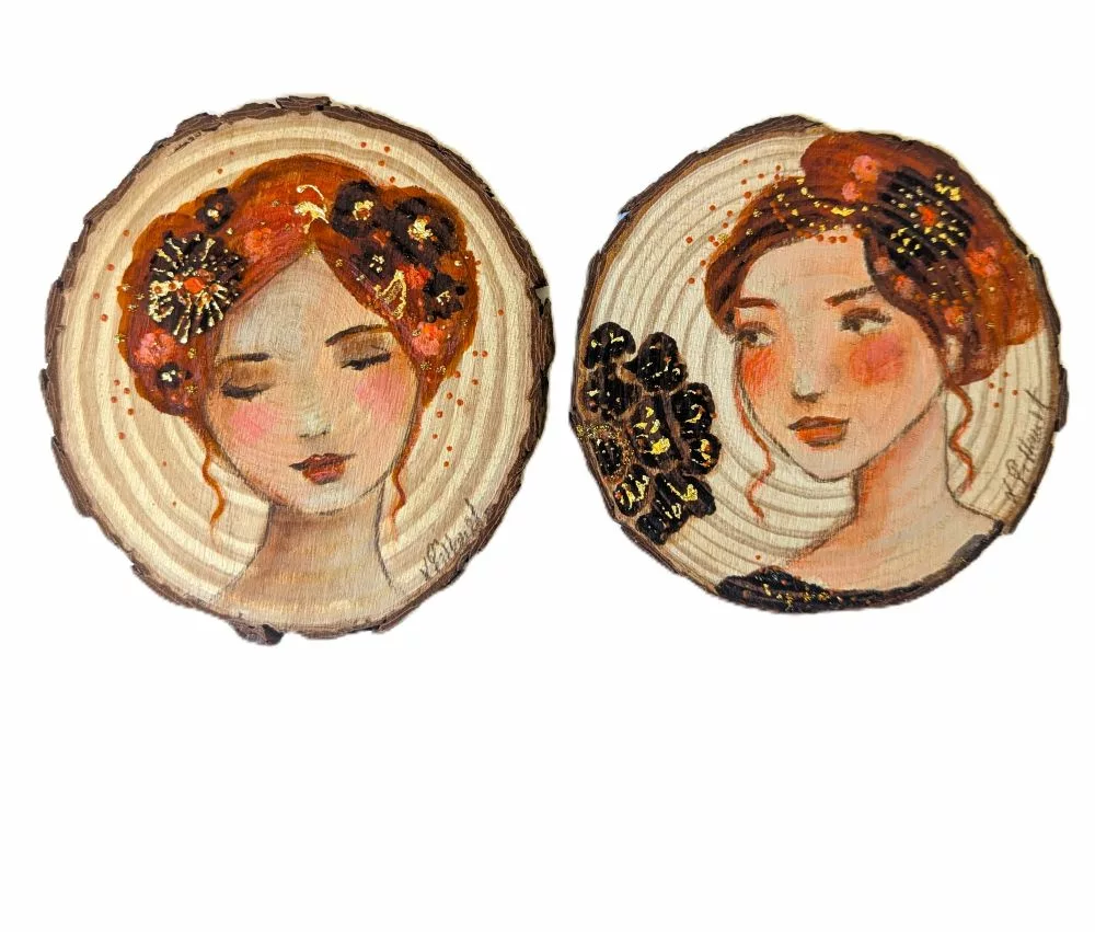 Portrait de femme rousse sur bois. Pensées fleuries.