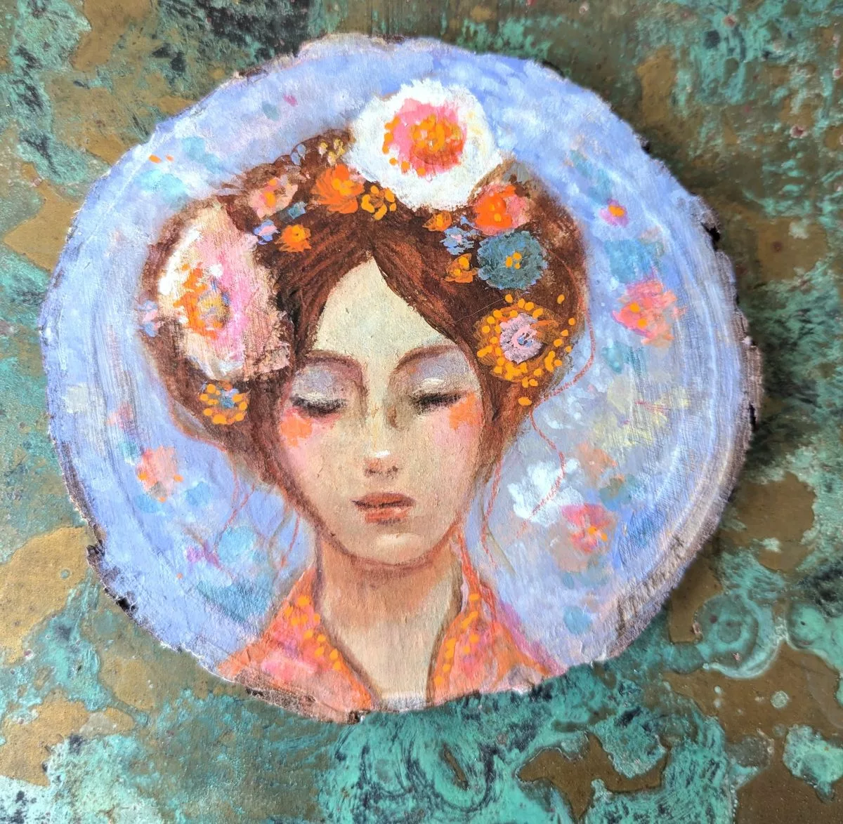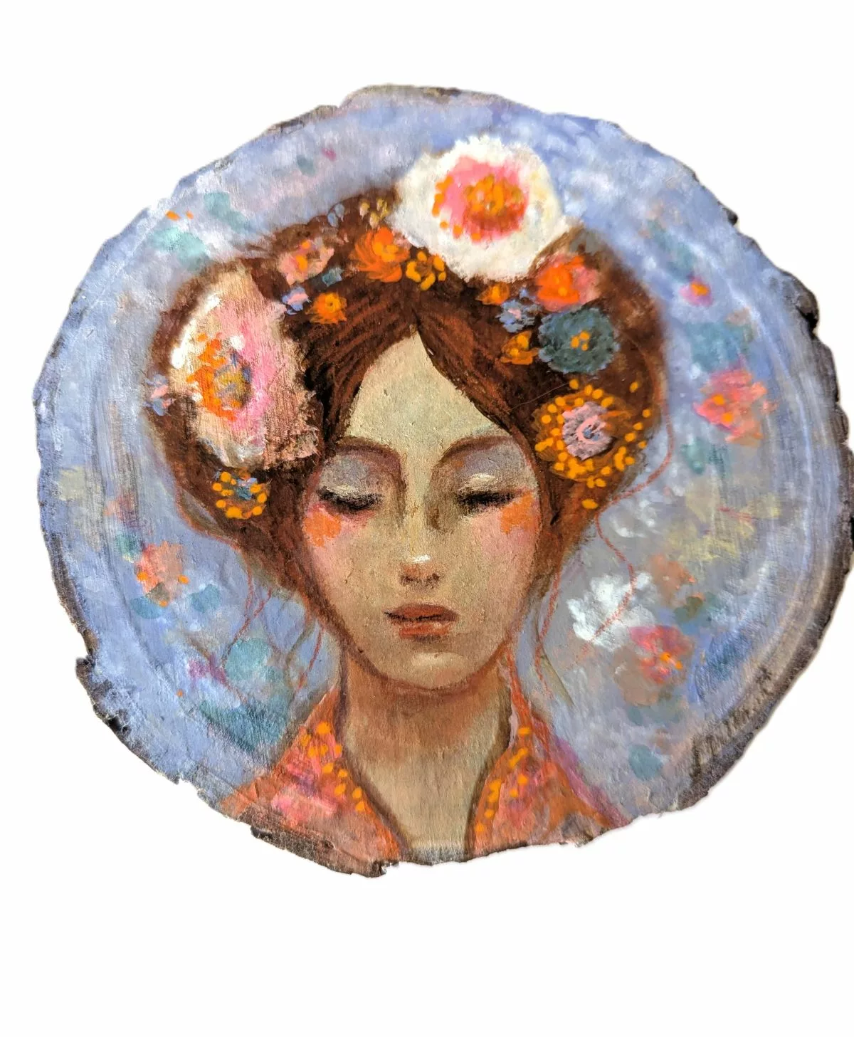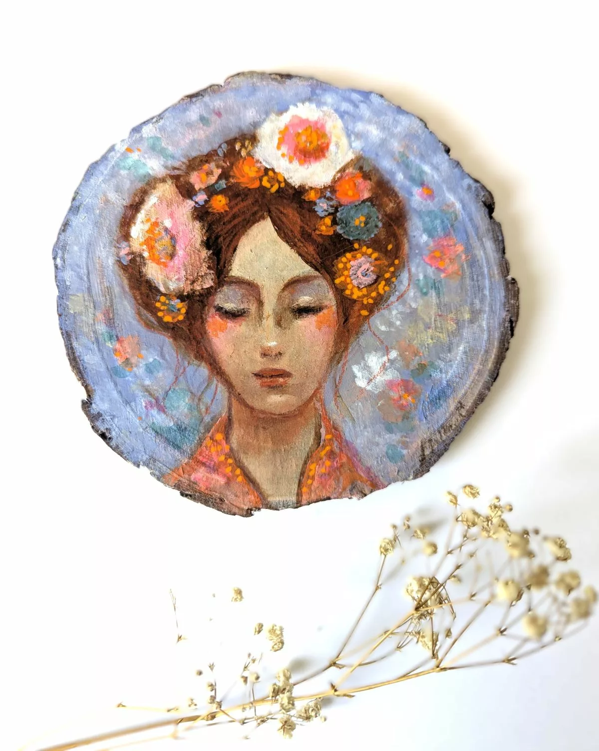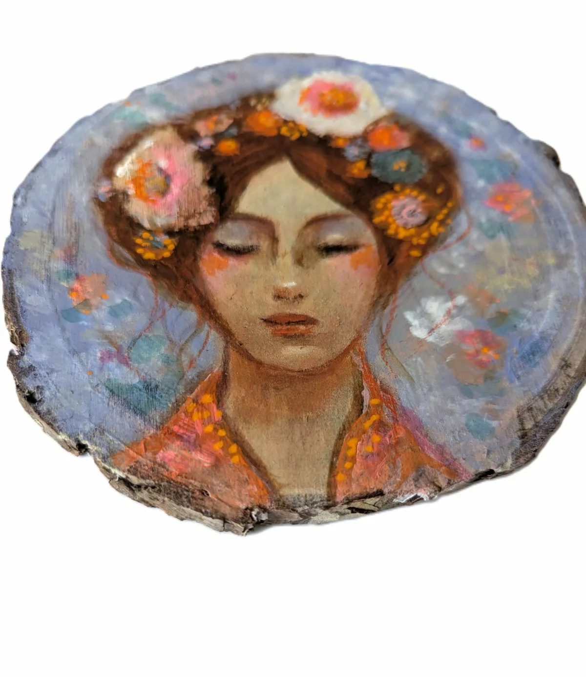 Portrait de femme aux yeux clos sur bois. Rêve de fleurs.