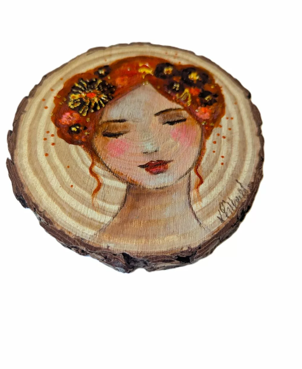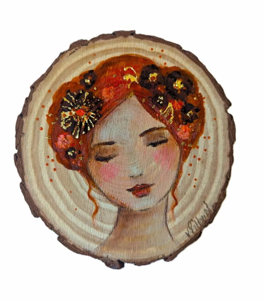 Femme rousse à la chevelure ornée de fleurs rose poudré, brun et or. Le support est un rondin de bois et le fond est laissé brut.
